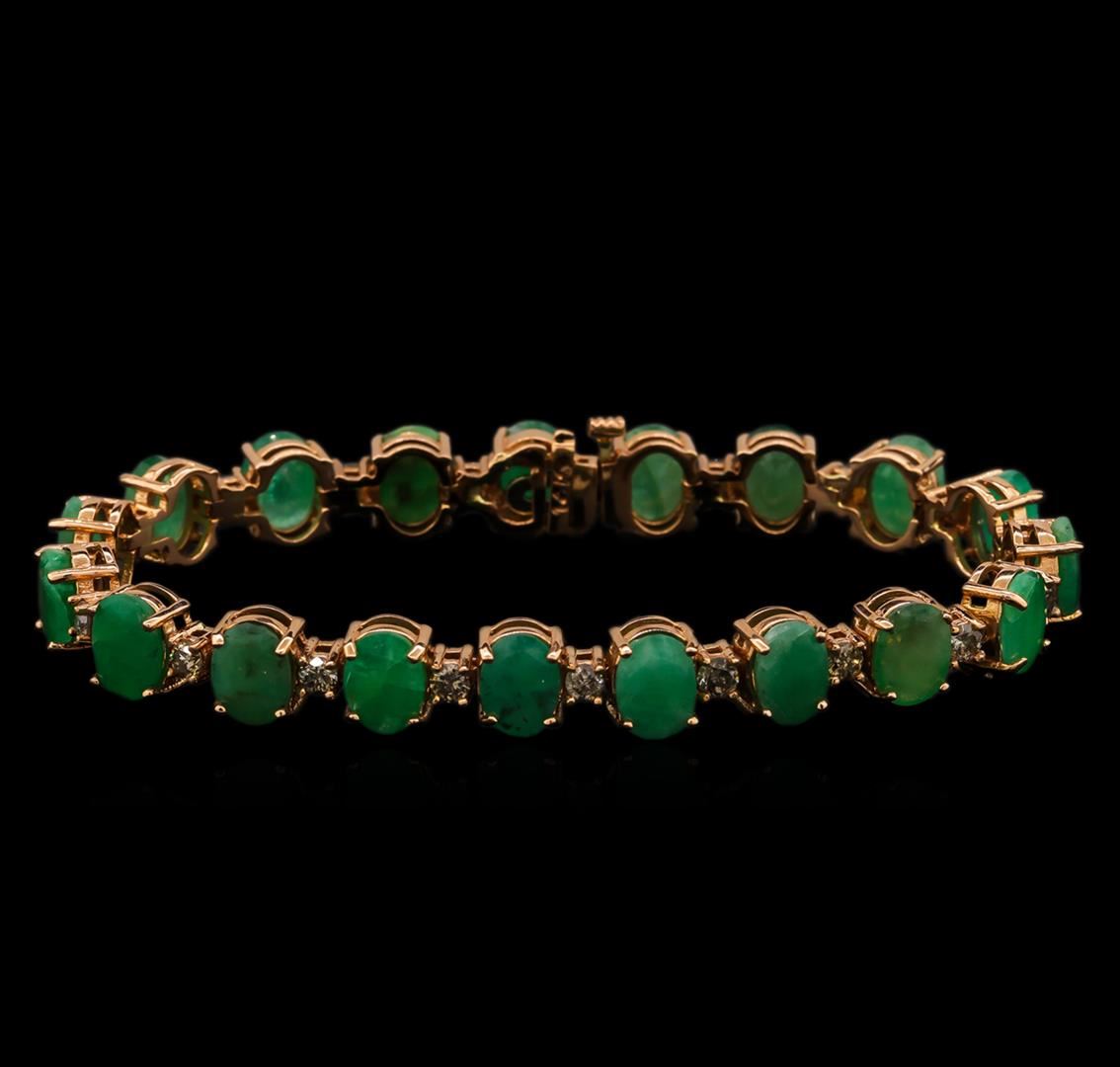 One electronically tested 14KT rose gold ladies cast & assembled emerald and diamond bracelet with a bright polish finish. Condition is new, good workmanship. Seven inch length bracelet features a flexible ribbon of emeralds alternated by diamonds terminating in a concealed clasp with safety bar. Identified with markings of "14K". Containing: Nineteen prong set oval mixed cut natural emeralds, measuring 8.00 x 6.00 x 3.90mm, 6%. bulge factor, approximate. Total Weight of 20.90ct., clarity is severely included, type III, medium, very slightly grayish, very slightly bluish green color, (GIA vslbG 5/3), cut is good. Transmitting light somewhat diffusely, translucent. Naturally occurring internal & external characteristics are present. Indications of oil residue. Measurements & the color grade are an average for the group. Graded in the setting. Nineteen prong set round brilliant cut diamonds, measuring 2.80 - 2.70 x 1.65mm (depth est.) approximate. Total Weight of 19 Stones = 1.54ct. Color grade is an average for the group. Graded in the setting. Clarity: I-1 to I-2. Total Weight of Colored Stones 20.90ct. Total Weight of Diamonds 1.54ct. Total Weight of Bracelet 20.40 grams. AIG Appraised at $9,950.00.