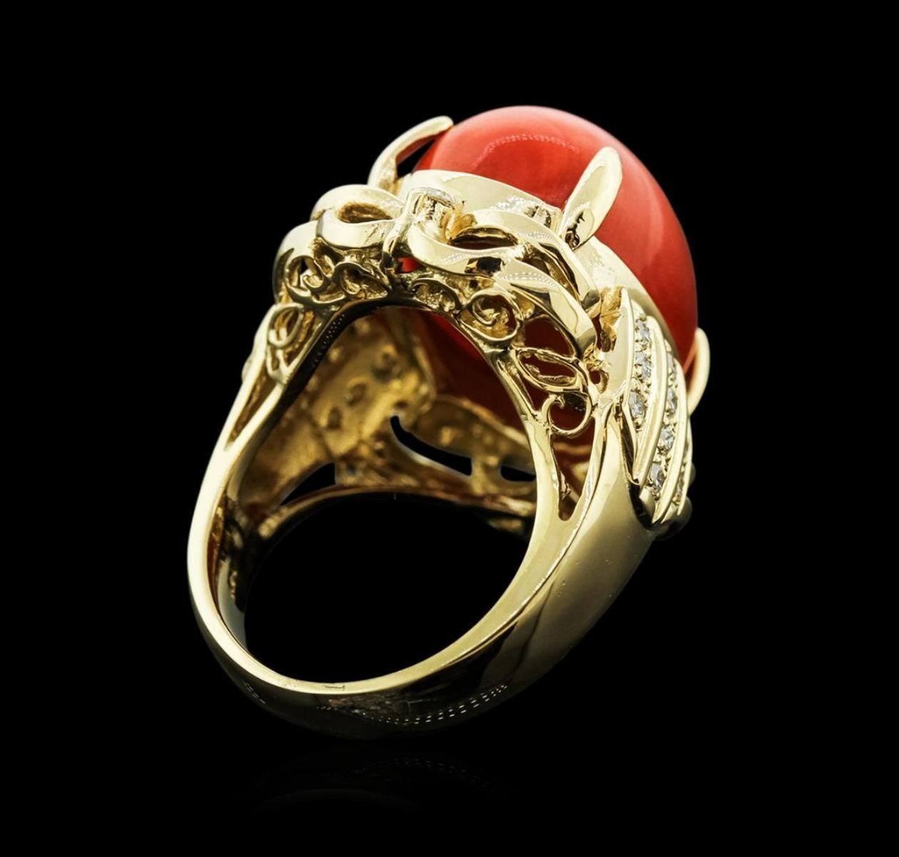 One electronically tested 14KT rose gold ladies cast coral and diamond ring with a bright polish finish. Identified with markings of "14K". Condition is new. Containing: One prong set oval cabochon cut natural red coral, measuring 20.00 x 15.00 x 9.75mm, approximate weight of 20.93ct., clarity is heavily included, medium, brownish, red color, (GIA R 5/1), cut is good. Thirty prong set round brilliant cut diamonds, measuring 1.70 - 1.70 x 1.02mm (depth est.) approximate total weight of 30 Stones = 0.54ct. . Clarity: SI-1 to SI-2. Color: H - I, Cut is Good. Colored gemstones are presumed to have been subjected to commonly used enhancement processes. All diamonds and colored gemstones are graded in the mounting, unless otherwise stated.. Total Weight of Colored Stones 20.93ct.. Total Weight of Diamonds 0.54ct.. Total Weight of Ring 18.30 grams. GGL Appraised.