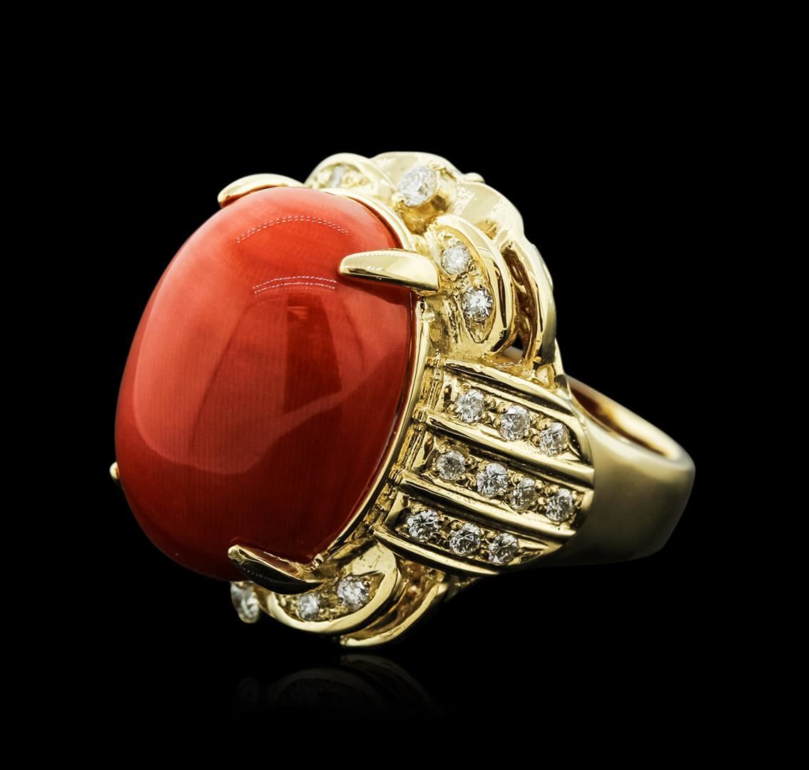 One electronically tested 14KT rose gold ladies cast coral and diamond ring with a bright polish finish. Identified with markings of "14K". Condition is new. Containing: One prong set oval cabochon cut natural red coral, measuring 20.00 x 15.00 x 9.75mm, approximate weight of 20.93ct., clarity is heavily included, medium, brownish, red color, (GIA R 5/1), cut is good. Thirty prong set round brilliant cut diamonds, measuring 1.70 - 1.70 x 1.02mm (depth est.) approximate total weight of 30 Stones = 0.54ct. . Clarity: SI-1 to SI-2. Color: H - I, Cut is Good. Colored gemstones are presumed to have been subjected to commonly used enhancement processes. All diamonds and colored gemstones are graded in the mounting, unless otherwise stated.. Total Weight of Colored Stones 20.93ct.. Total Weight of Diamonds 0.54ct.. Total Weight of Ring 18.30 grams. GGL Appraised.