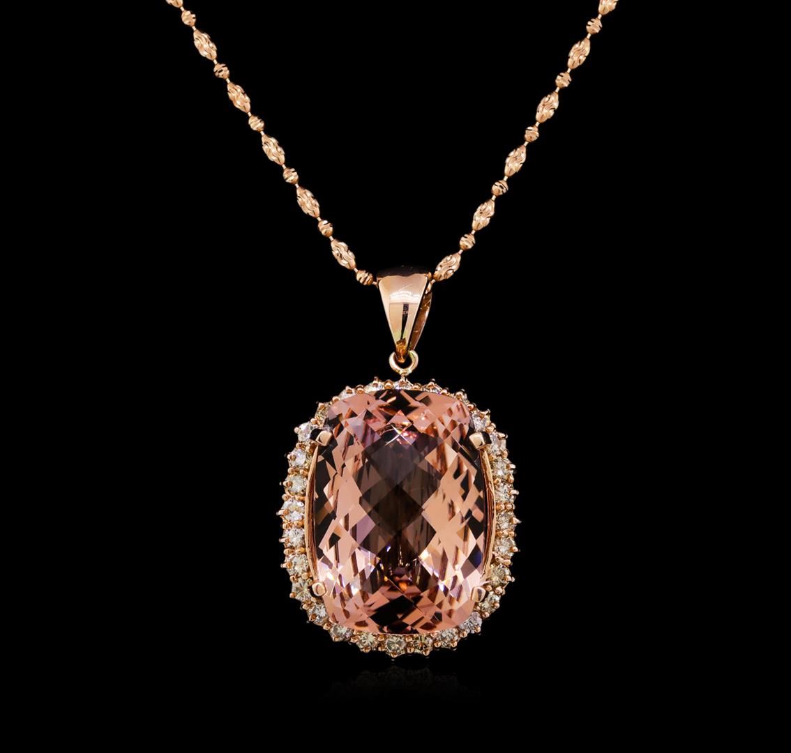 One electronically tested 14KT rose gold ladies cast & assembled morganite and diamond pendant with chain. The pendant features a morganite set within a diamond bezel, completed by a rose gold bail. The pendant is supported by an elaborate eighteen inch length designer style bright cut beaded chain terminating in a lobster claw clasp. Bright polish finish. Identified with markings of "K14". Condition is new, good workmanship. Containing: One prong set rectangular cushion modified mixed cut natural morganite, measuring 25.88 x 18.05 x 10.29mm, exact weight 29.85ct., type I Clarity is eye clean, medium, very slightly brownish, Pink-Orange color, (GIA PiO 5/3), cut is good. Transmitting light with no distortion, transparent. GIA Colored Stone Grading Report attached. Graded loose prior to setting in the GIA Laboratory, Report # 6157736139.Twenty-Eight prong set round brilliant cut diamonds, measuring 2.70 - 2.50 x 1.56mm (depth est.) approximate. Total Weight of 28 Stones = 1.93ct. Faint secondary color throughout. Graded in the setting. Clarity: SI-1 to I-1 . Color: K - M. Total Weight of Colored Stones 29.85ct.. Total Weight of Diamonds 1.93ct. AIG Appraised at $27,470.00.