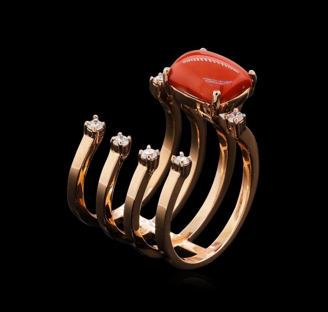 One electronically tested 14KT rose gold ladies cast coral and diamond ring with a bright polish finish. Identified with markings of "K14". Condition is new. Containing: One prong set oval cabochon cut natural pink coral, measuring 10.00 x 8.00 x 5.20mm, approximate weight of 3.06ct., clarity is heavily included, medium light, very slightly grayish, pink color, (GIA Pk 4/3), cut is good. Six prong set round brilliant cut diamonds, measuring 2.00 - 2.00 x 1.20mm (depth est.) approximate total weight of 6 Stones = 0.18ct. Clarity: SI-1 to I-1. Color: H - I, Cut is Good. Colored gemstones are presumed to have been subjected to commonly used enhancement processes. All diamonds and colored gemstones are graded in the mounting, unless otherwise stated. Total Weight of Colored Stones 3.06ct. Total Weight of Diamonds 0.18ct. Total Weight of Ring 7.80 grams. GGL Appraised at $1,645.00.