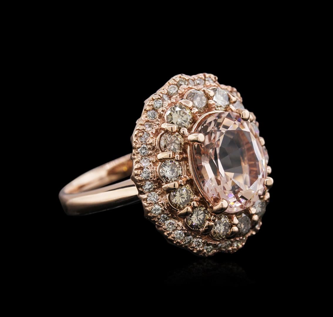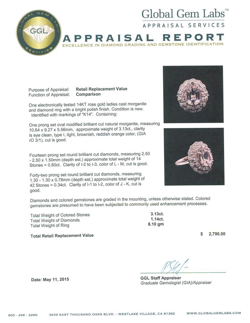 One electronically tested 14KT rose gold ladies cast morganite and diamond ring with a bright polish finish. Identified with markings of "K14". Condition is new. Containing: One prong set oval modified brilliant cut natural morganite, measuring 10.64 x 9.27 x 5.56mm, approximate weight of 3.13ct., clarity is eye clean, type I, light, brownish, reddish orange color, (GIA rO 3/1), cut is good. Fourteen prong set round brilliant cut diamonds, measuring 2.50 - 2.50 x 1.50mm (depth est.) approximate total weight of 14 Stones = 0.80ct. Clarity: I-2 to I-3. Color: L - M, Cut is Good. Forty-Two prong set round brilliant cut diamonds, measuring 1.30 - 1.30 x 0.78mm (depth est.) approximate total weight of 42 Stones = 0.34ct. Clarity: I-1 to I-2. Color: J - K, Cut is Good. Diamonds and colored gemstones are graded in the mounting, unless otherwise stated. Colored gemstones are presumed to have been subjected to commonly used enhancement processes. Total Weight of Colored Stones 3.13ct. Total Weight of Diamonds 1.14ct. Total Weight of Ring 8.10 grams. GGL Appraised at $2,790.00.