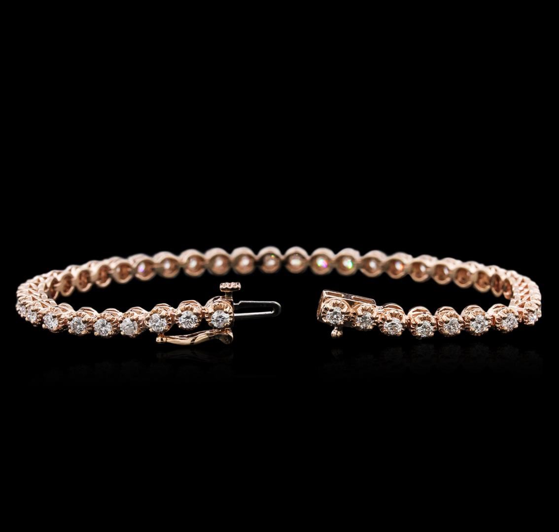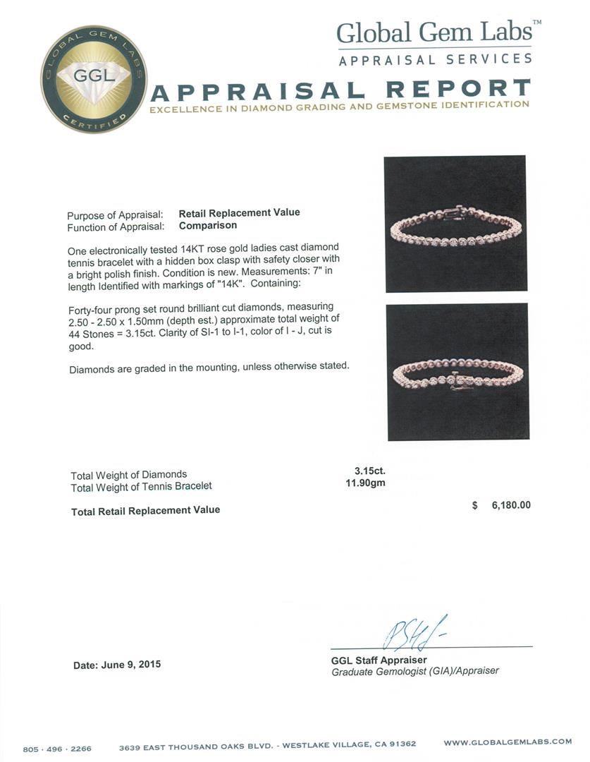 One electronically tested 14KT rose gold ladies cast diamond tennis bracelet with a hidden box clasp with safety closer with a bright polish finish. Measurements: 7" in length Identified with markings of "14K". Condition is new. Containing: Forty-Four prong set round brilliant cut diamonds, measuring 2.50 - 2.50 x 1.50mm (depth est.) approximate total weight of 44 Stones = 3.15ct. Clarity: SI-1 to I-1. Color: I - J, Cut is Good. Diamonds are graded in the mounting, unless otherwise stated. Total Weight of Diamonds 3.15ct. Total Weight of Tennis Bracelet 11.90 grams. GGL Appraised at $6,180.00.