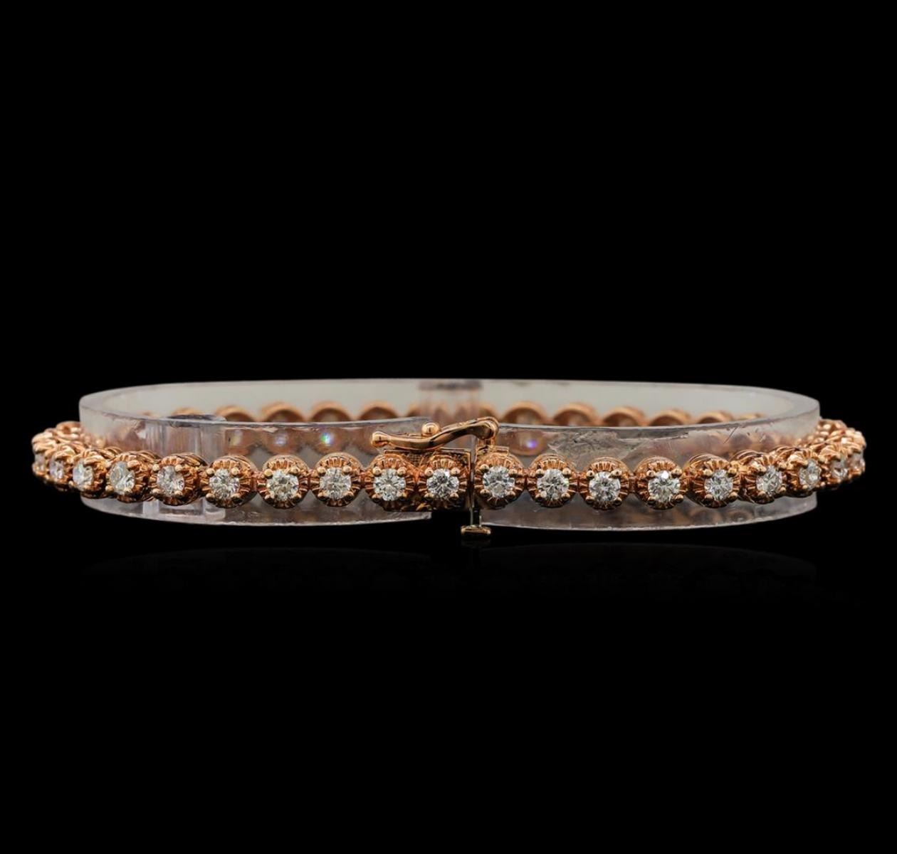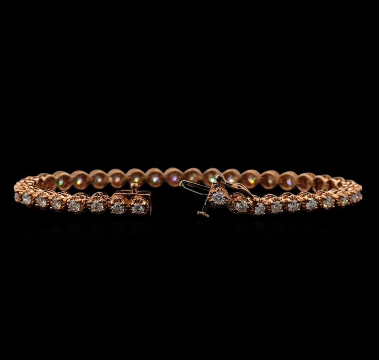 One electronically tested 14KT rose gold ladies cast diamond tennis bracelet with a hidden box clasp with safety closer with a bright polish finish. Measurements: 7" in length Identified with markings of "14K". Condition is new. Containing: Thirty-Nine prong set round brilliant cut diamonds, measuring 2.80 - 2.80 x 1.68mm (depth est.) approximate total weight of 39 Stones = 3.28ct. Clarity: SI-2 to I-1. Color: H - I, Cut is Good. All diamonds are graded in the mounting, unless otherwise stated. Total Weight of Diamonds 3.28ct. Total Weight of Tennis Bracelet 14.70 grams. GGL Appraised.