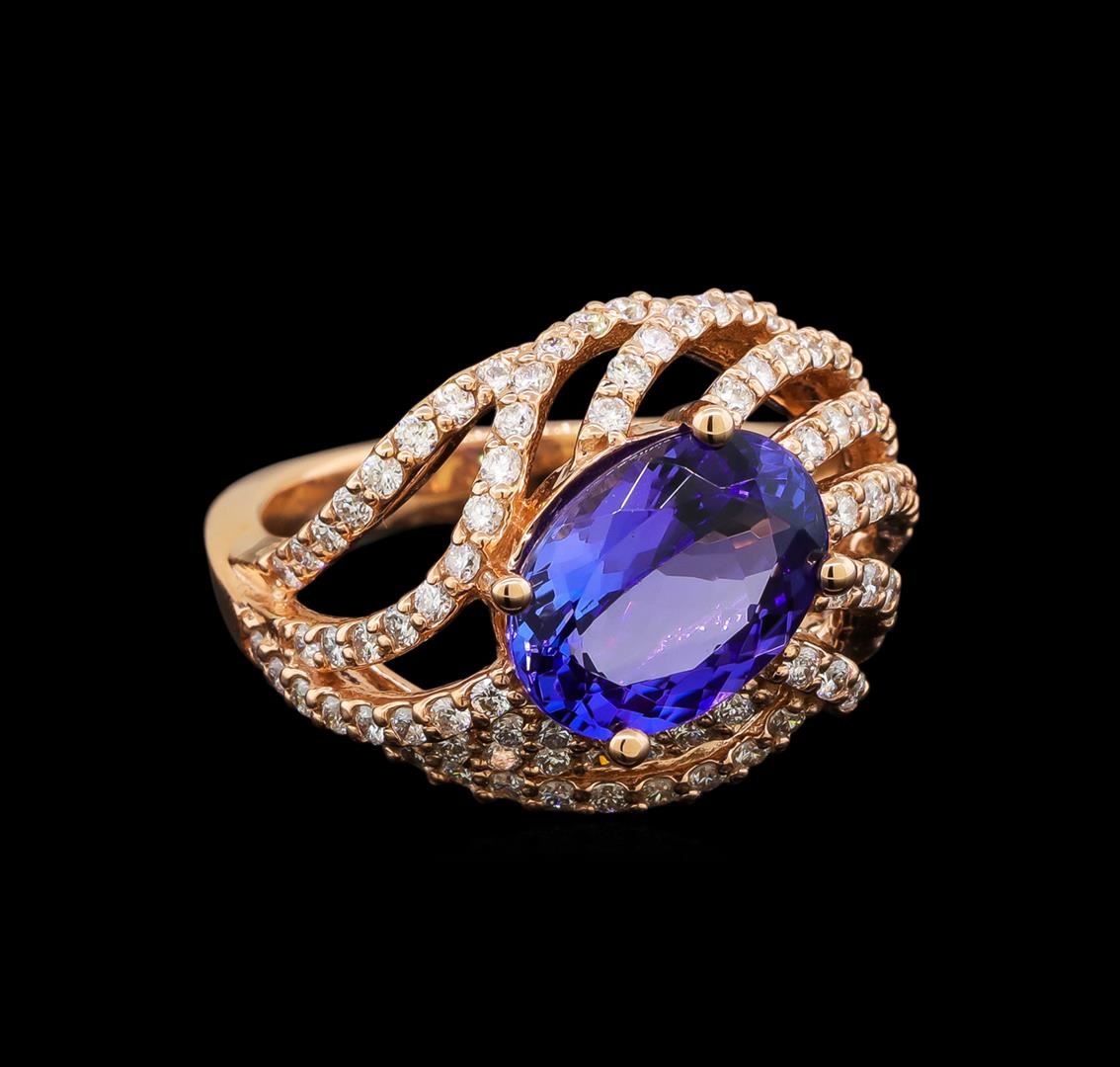 One electronically tested 14KT rose gold ladies cast tanzanite and diamond ring with a bright polish finish. Identified with markings of "K14". Condition is new. Containing: One prong set oval modified brilliant cut natural tanzanite, measuring 11.20 x 8.20 x 5.21mm, approximate weight of 3.37ct., clarity is eye clean, type I, medium light, very slightly grayish, bluish violet color, (GIA bV 4/3), cut is good. Ninety-Five prong set round brilliant cut diamonds, measuring 1.30 - 1.30 x 0.78mm (depth est.) approximate total weight of 95 Stones = 0.76ct. Clarity: SI-2 to I-2. Color: J, Cut is Good. Colored gemstones are presumed to have been subjected to commonly used enhancement processes. All diamonds and colored gemstones are graded in the mounting, unless otherwise stated. Total Weight of Colored Stones 3.37ct. Total Weight of Diamonds 0.76ct. Total Weight of Ring 7.40 grams. GGL Appraised at $5,245.00.