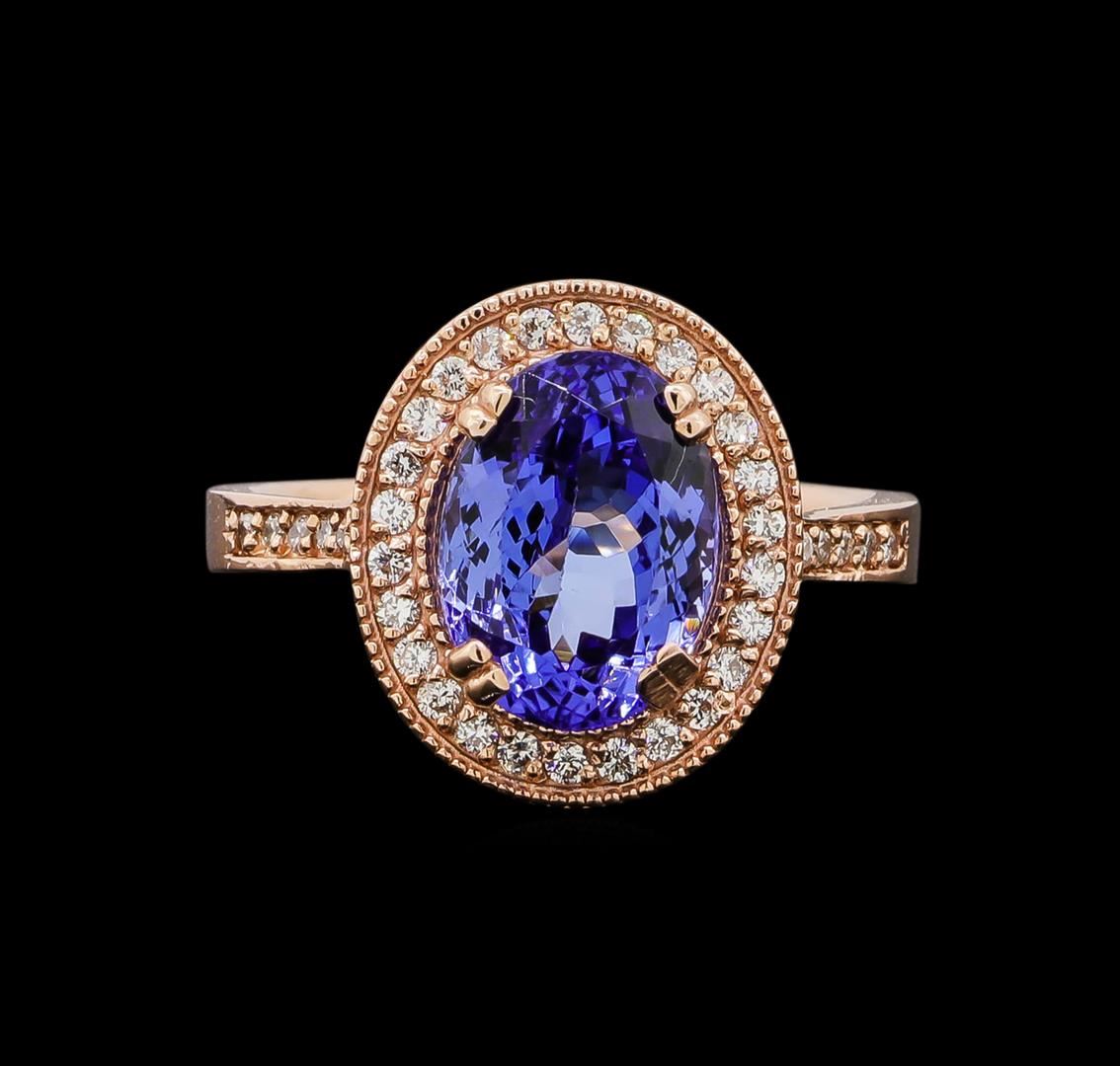 One electronically tested 14KT rose gold ladies cast tanzanite and diamond ring with a bright polish finish. Identified with markings of "14K". Condition is new. Containing: One prong set oval modified brilliant cut natural tanzanite, measuring 10.90 x 8.00 x 5.50mm, approximate weight of 3.37ct., clarity is eye clean, type I, medium, moderately strong, violet color, (GIA V 5/4), cut is good. Thirty-Six prong set round brilliant cut diamonds, measuring 1.00 - 1.00 x 0.60mm (depth est.) approximate total weight of 36 Stones = 0.13ct. Clarity: SI-2 to I-1. Color: I - J, Cut is Good. Colored gemstones are presumed to have been subjected to commonly used enhancement processes. All diamonds and colored gemstones are graded in the mounting, unless otherwise stated. Total Weight of Colored Stones 3.37ct. Total Weight of Diamonds 0.13ct. Total Weight of Ring 5.60 grams. GGL Appraised at $3,310.00.