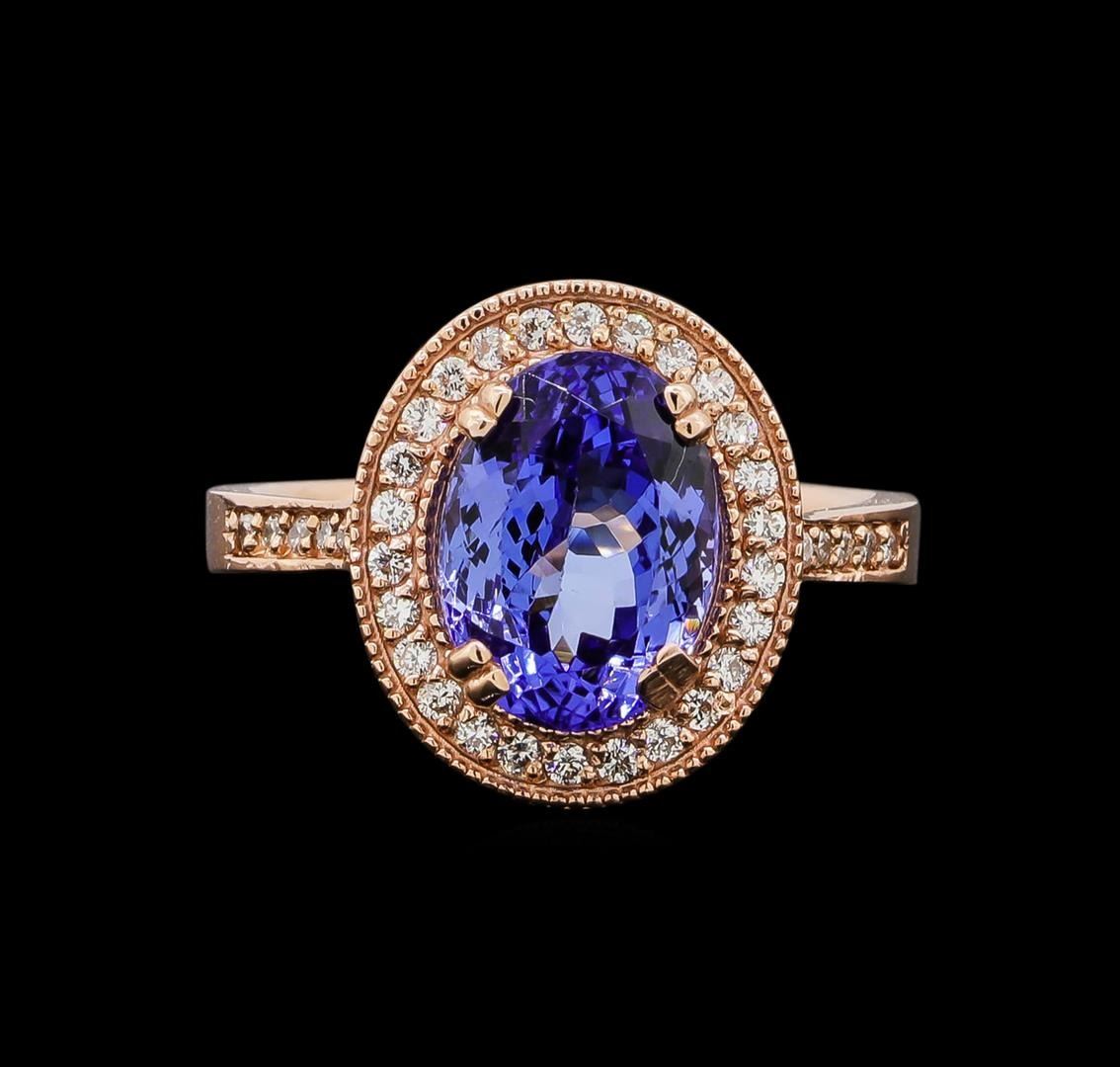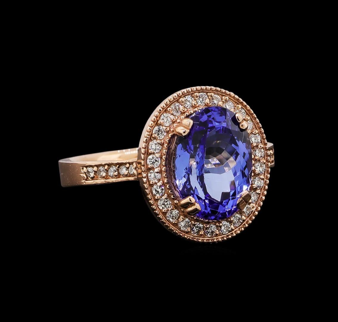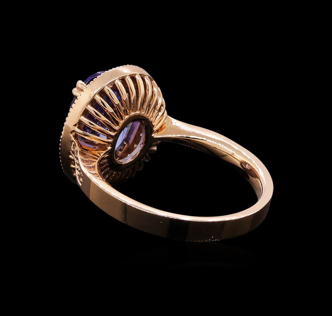 One electronically tested 14KT rose gold ladies cast tanzanite and diamond ring with a bright polish finish. Identified with markings of "14K". Condition is new. Containing: One prong set oval modified brilliant cut natural tanzanite, measuring 10.90 x 8.00 x 5.50mm, approximate weight of 3.37ct., clarity is eye clean, type I, medium, moderately strong, violet color, (GIA V 5/4), cut is good. Thirty-Six prong set round brilliant cut diamonds, measuring 1.00 - 1.00 x 0.60mm (depth est.) approximate total weight of 36 Stones = 0.13ct. Clarity: SI-2 to I-1. Color: I - J, Cut is Good. Colored gemstones are presumed to have been subjected to commonly used enhancement processes. All diamonds and colored gemstones are graded in the mounting, unless otherwise stated. Total Weight of Colored Stones 3.37ct. Total Weight of Diamonds 0.13ct. Total Weight of Ring 5.60 grams. GGL Appraised.