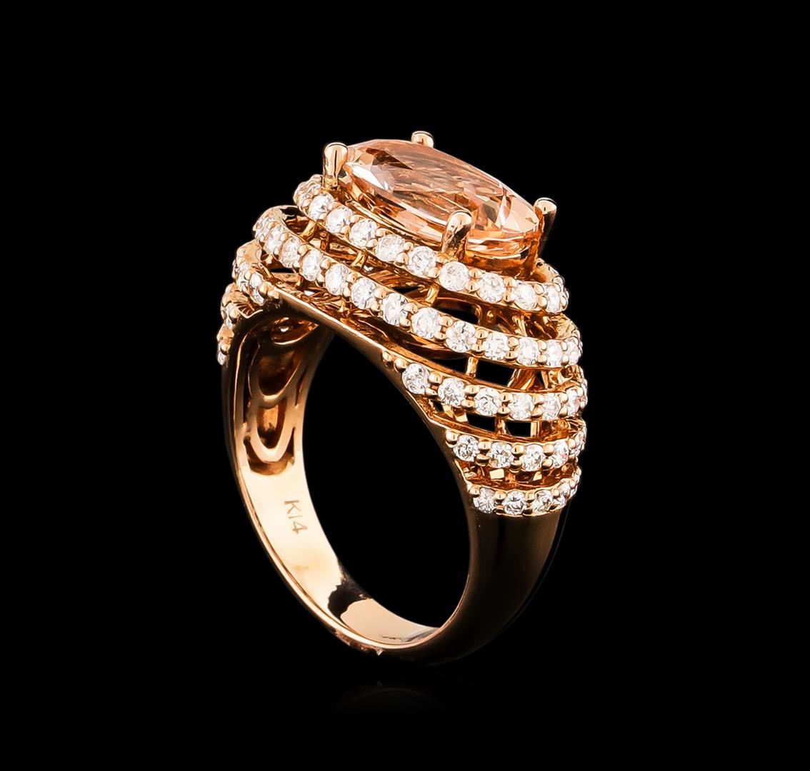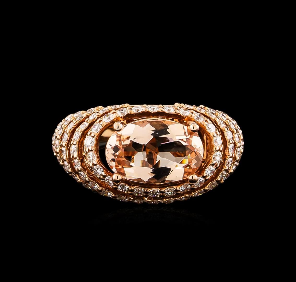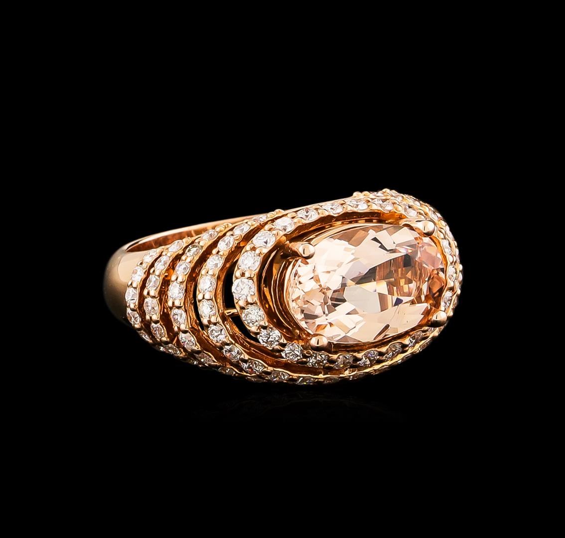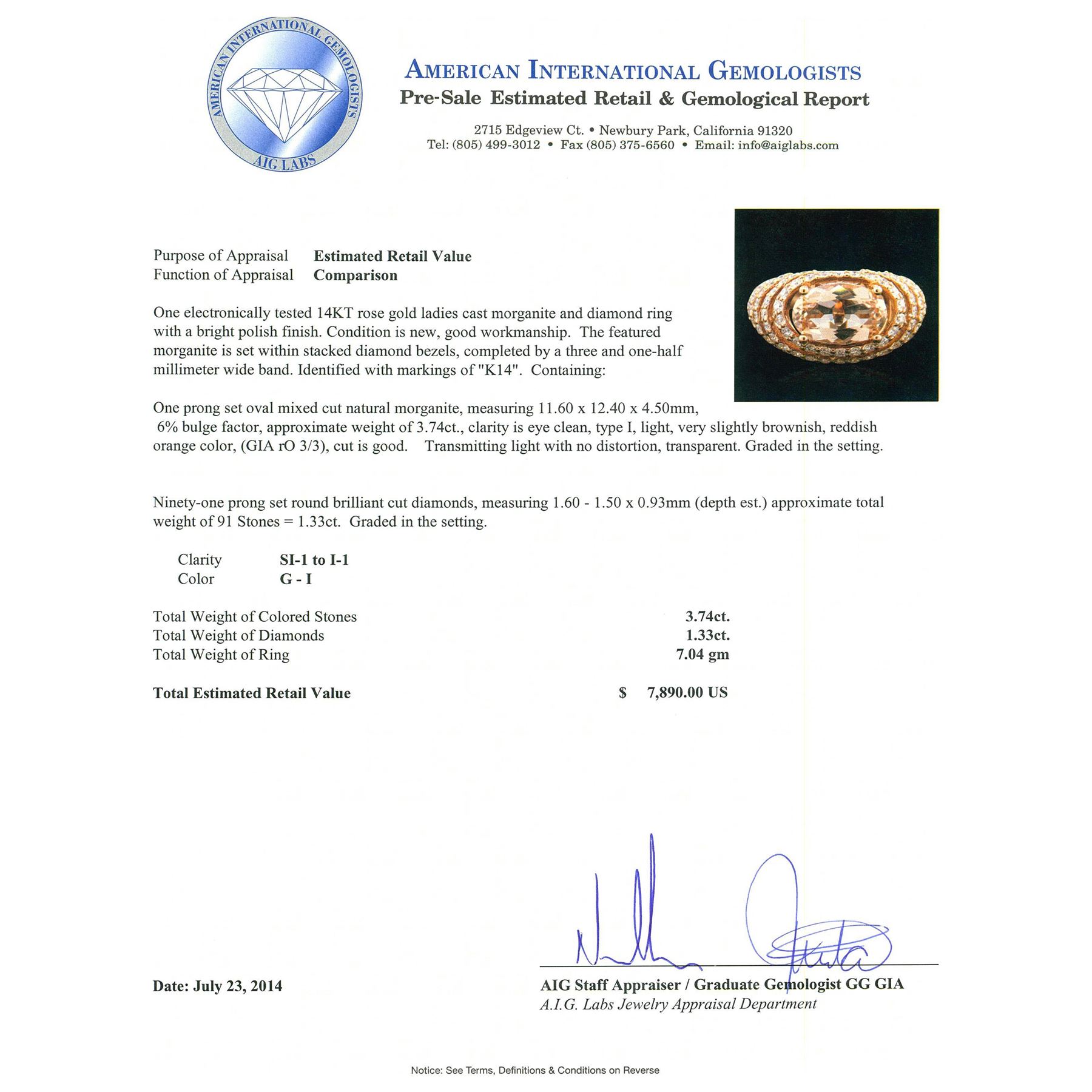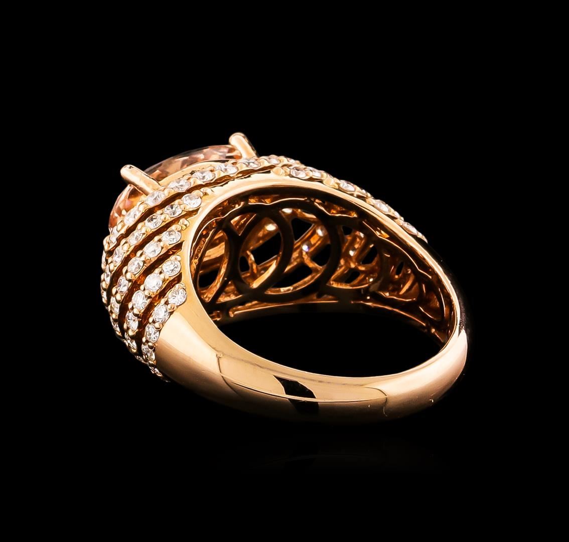 One electronically tested 14KT rose gold ladies cast morganite and diamond ring with a bright polish finish. Condition is new, good workmanship. The featured morganite is set within stacked diamond bezels, completed by a three and one-half millimeter wide band. Identified with markings of "K14". Containing: One prong set oval mixed cut natural morganite, measuring 11.60 x 12.40 x 4.50mm, 6%. bulge factor, approximate weight of 3.74ct., clarity is eye clean, type I, light, very slightly brownish, reddish orange color, (GIA rO 3/3), cut is good. Transmitting light with no distortion, transparent. Graded in the setting. Ninety-One prong set round brilliant cut diamonds, measuring 1.60 - 1.50 x 0.93mm (depth est.) approximate. Total Weight of 91 Stones = 1.33ct. Graded in the setting. Clarity: SI-1 to I-1. Color: G - I. Total Weight of Colored Stones 3.74ct. Total Weight of Diamonds 1.33ct. Total Weight of Ring 7.04 grams. AIG Appraised.
