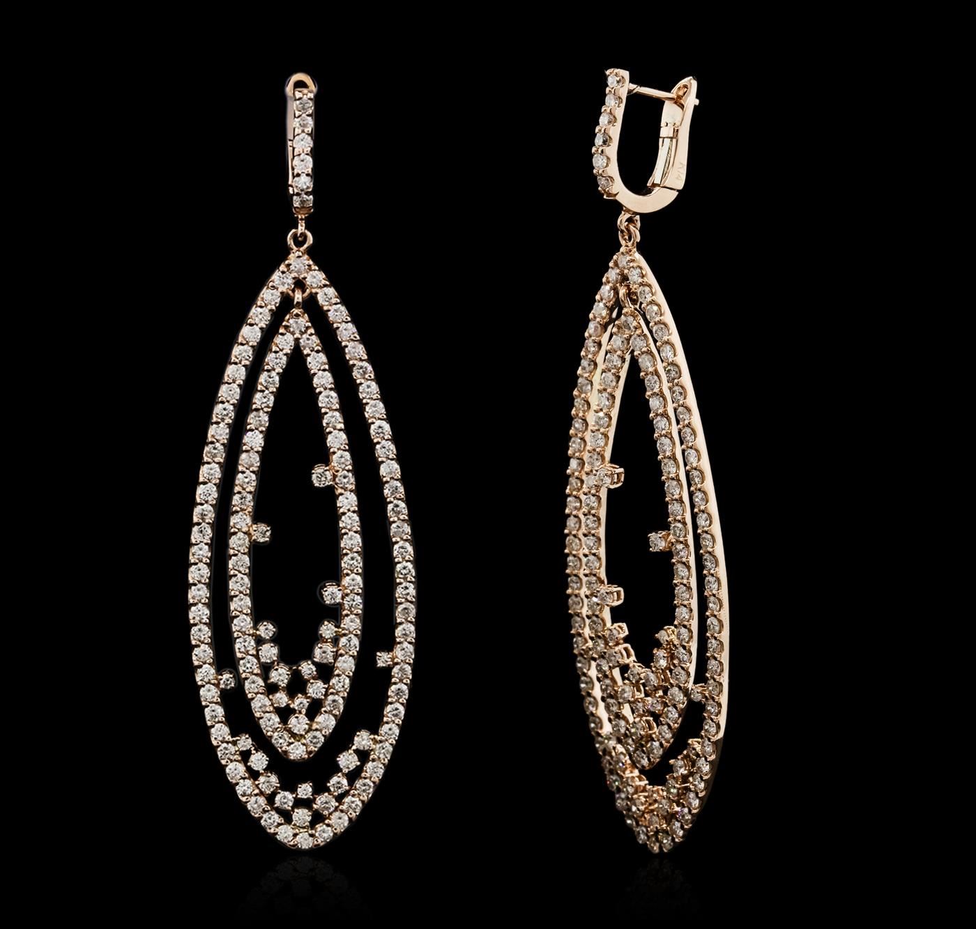 One pair electronically tested 14KT rose gold ladies cast diamond earrings with hinged clip backs with a bright polish finish. Identified with markings of "K14". Condition is new. Containing: Two Hundred Seventy-Six prong set round brilliant cut diamonds, measuring 1.70 - 1.40 x 0.93mm (depth est.) approximate total weight of 276 Stones = 3.75ct. Clarity: I-1 to I-2. Color: J - K, Cut is Good. All diamonds are graded in the mounting, unless otherwise stated. Total Weight of Diamonds 3.75ct. Total Weight of Earrings 16.80 grams. GGL Appraised.