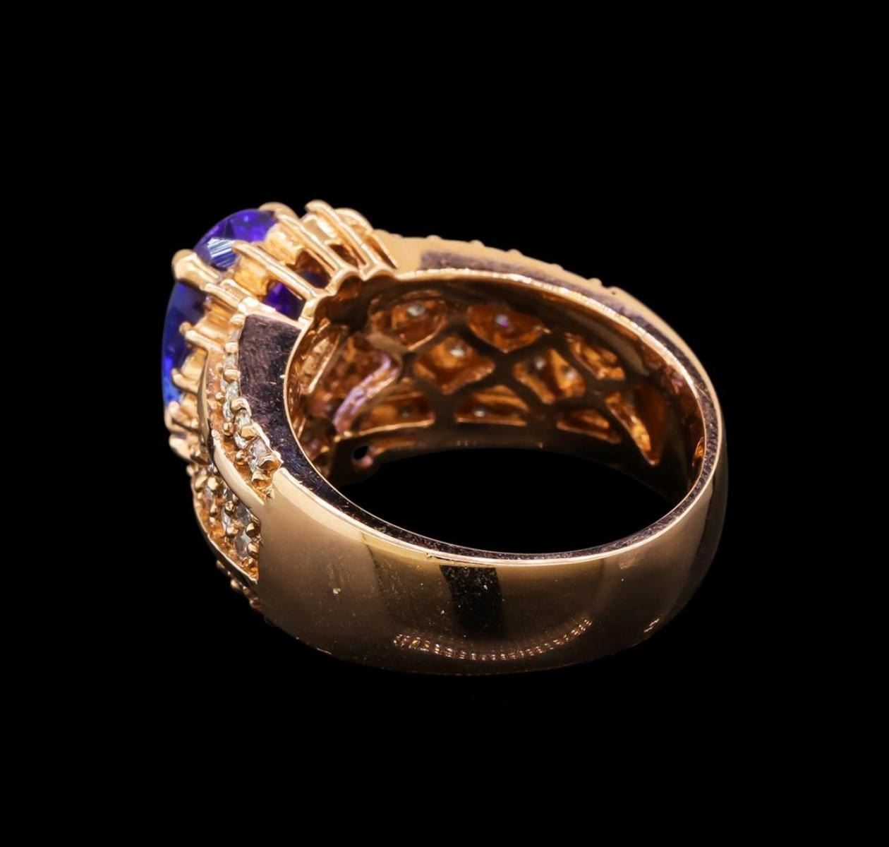 One electronically tested 14KT rose gold ladies cast tanzanite and diamond ring with a bright polish finish. Identified with markings of "K14". Condition is new. Containing: One prong set oval modified brilliant cut natural tanzanite, measuring 11.10 x 8.60 x 5.59mm, approximate weight of 3.75ct., clarity is eye clean, type I, medium light, very slightly grayish, violet color, (GIA V 4/3), cut is good. Fifty-Eight channel set round brilliant cut diamonds, measuring 1.80 - 1.80 x 1.08mm (depth est.) approximate total weight of 58 Stones = 1.24ct. Clarity: SI-1 to I-1. Color: H - I, Cut is Good. Colored gemstones are presumed to have been subjected to commonly used enhancement processes. All diamonds and colored gemstones are graded in the mounting, unless otherwise stated. Total Weight of Colored Stones 3.75ct. Total Weight of Diamonds 1.24ct. Total Weight of Ring 10.90 grams. GGL Appraised.