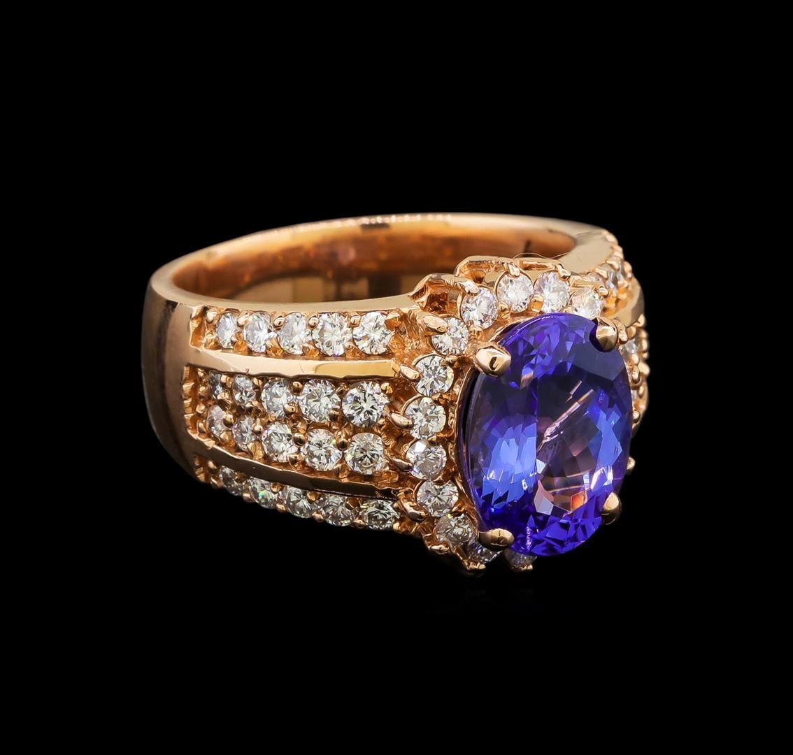 One electronically tested 14KT rose gold ladies cast tanzanite and diamond ring with a bright polish finish. Identified with markings of "K14". Condition is new. Containing: One prong set oval modified brilliant cut natural tanzanite, measuring 11.10 x 8.60 x 5.59mm, approximate weight of 3.75ct., clarity is eye clean, type I, medium light, very slightly grayish, violet color, (GIA V 4/3), cut is good. Fifty-Eight channel set round brilliant cut diamonds, measuring 1.80 - 1.80 x 1.08mm (depth est.) approximate total weight of 58 Stones = 1.24ct. Clarity: SI-1 to I-1. Color: H - I, Cut is Good. Colored gemstones are presumed to have been subjected to commonly used enhancement processes. All diamonds and colored gemstones are graded in the mounting, unless otherwise stated. Total Weight of Colored Stones 3.75ct. Total Weight of Diamonds 1.24ct. Total Weight of Ring 10.90 grams. GGL Appraised.