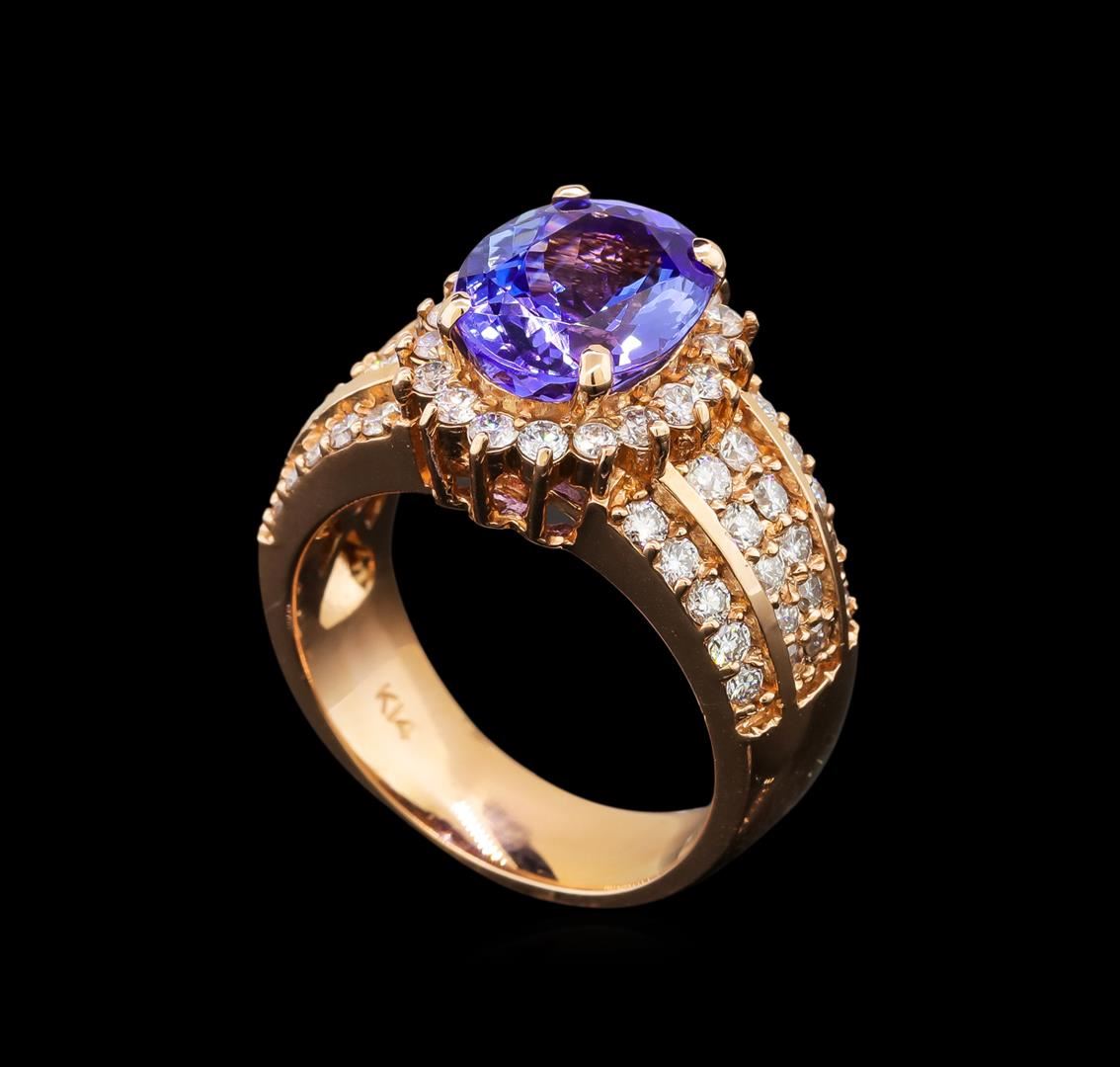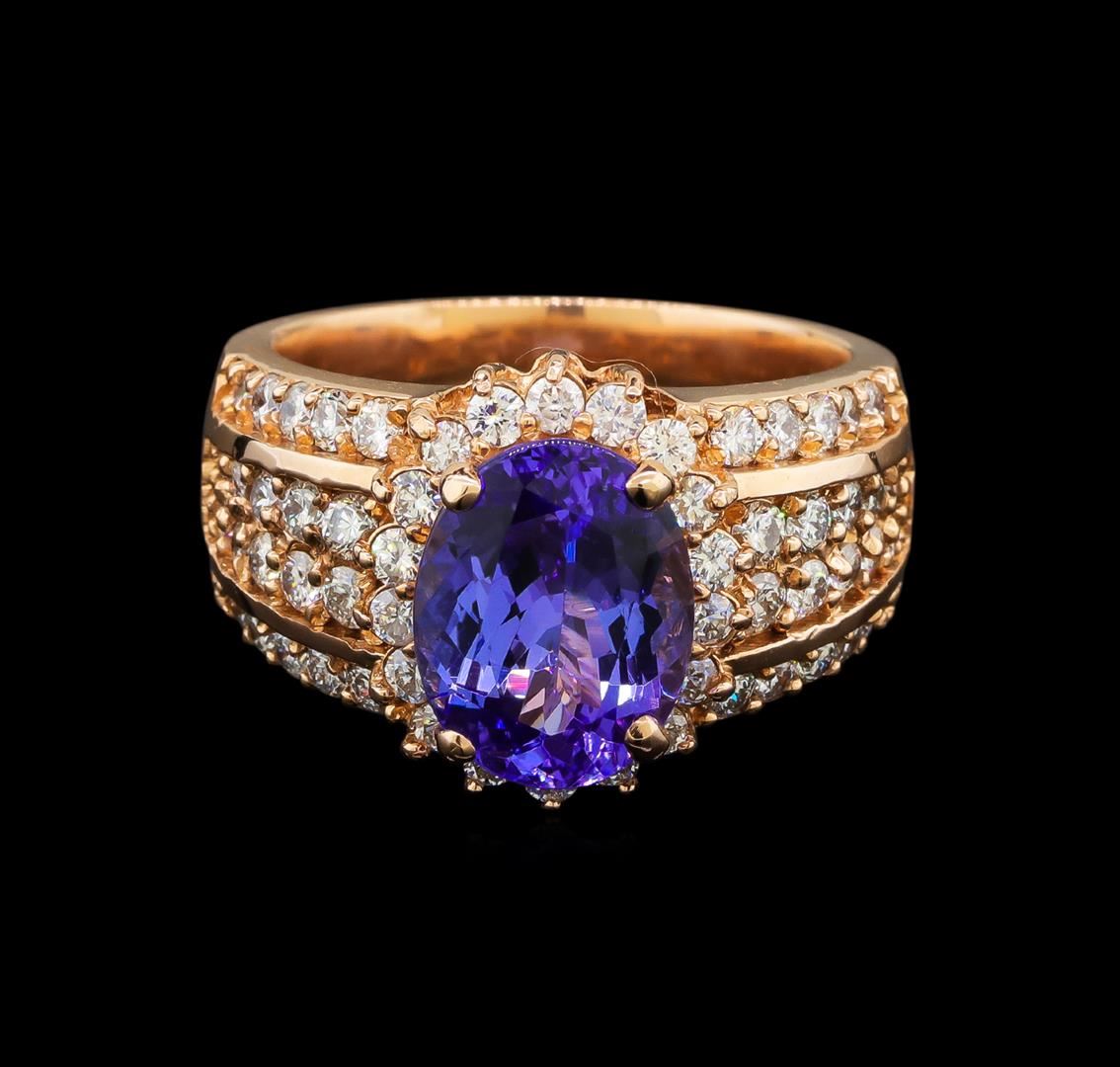 One electronically tested 14KT rose gold ladies cast tanzanite and diamond ring with a bright polish finish. Identified with markings of "K14". Condition is new. Containing: One prong set oval modified brilliant cut natural tanzanite, measuring 11.10 x 8.60 x 5.59mm, approximate weight of 3.75ct., clarity is eye clean, type I, medium light, very slightly grayish, violet color, (GIA V 4/3), cut is good. Fifty-Eight channel set round brilliant cut diamonds, measuring 1.80 - 1.80 x 1.08mm (depth est.) approximate total weight of 58 Stones = 1.24ct. Clarity: SI-1 to I-1. Color: H - I, Cut is Good. Colored gemstones are presumed to have been subjected to commonly used enhancement processes. All diamonds and colored gemstones are graded in the mounting, unless otherwise stated. Total Weight of Colored Stones 3.75ct. Total Weight of Diamonds 1.24ct. Total Weight of Ring 10.90 grams. GGL Appraised.