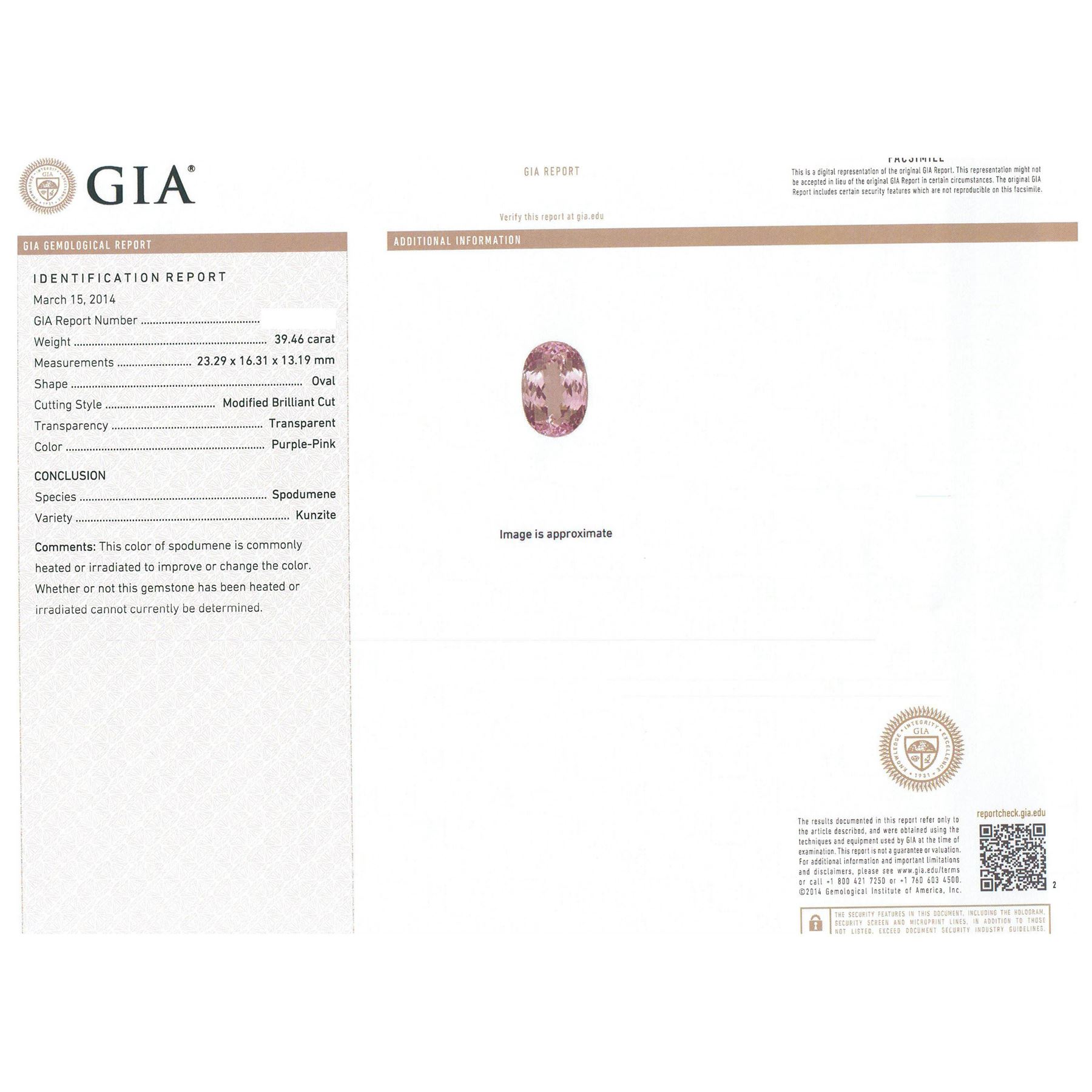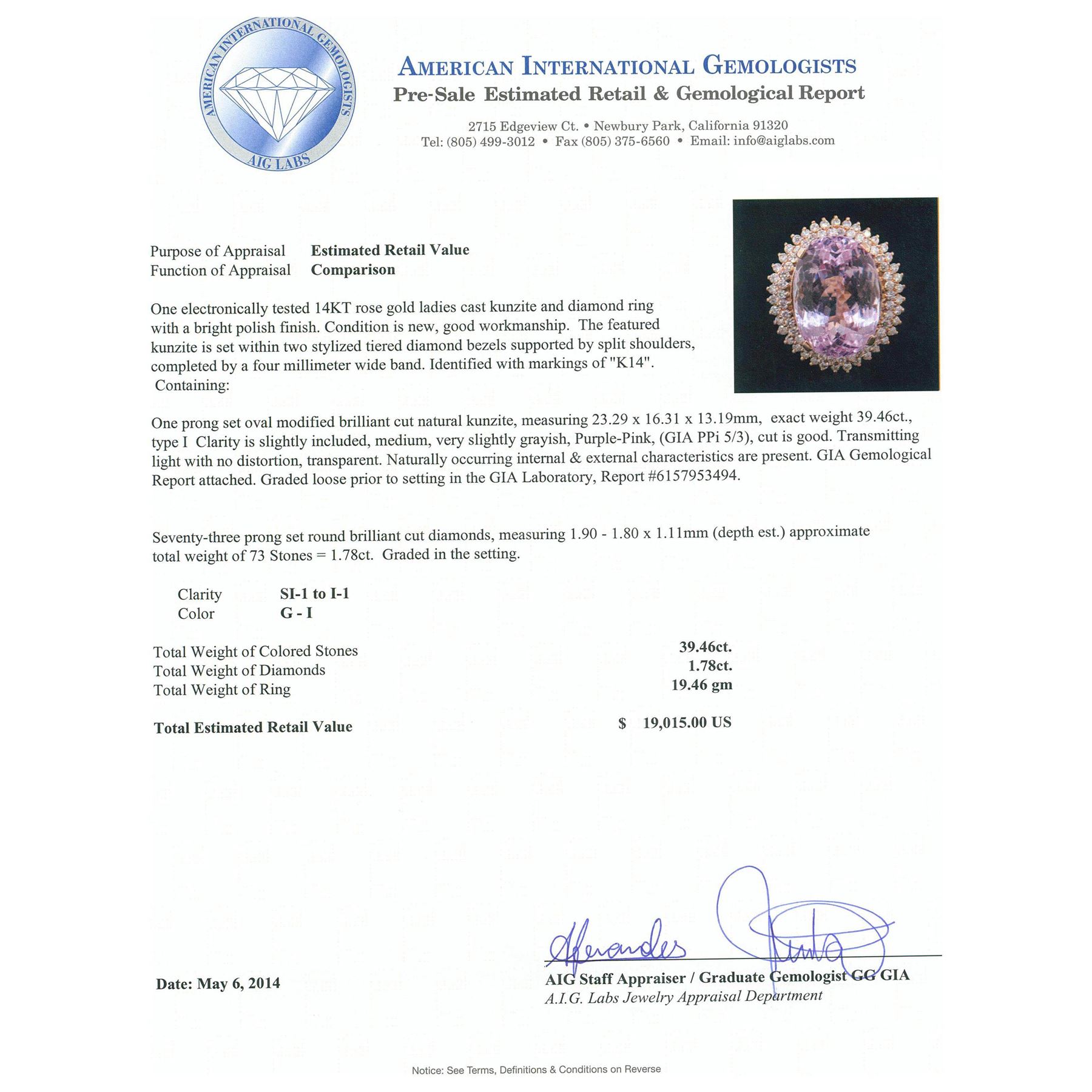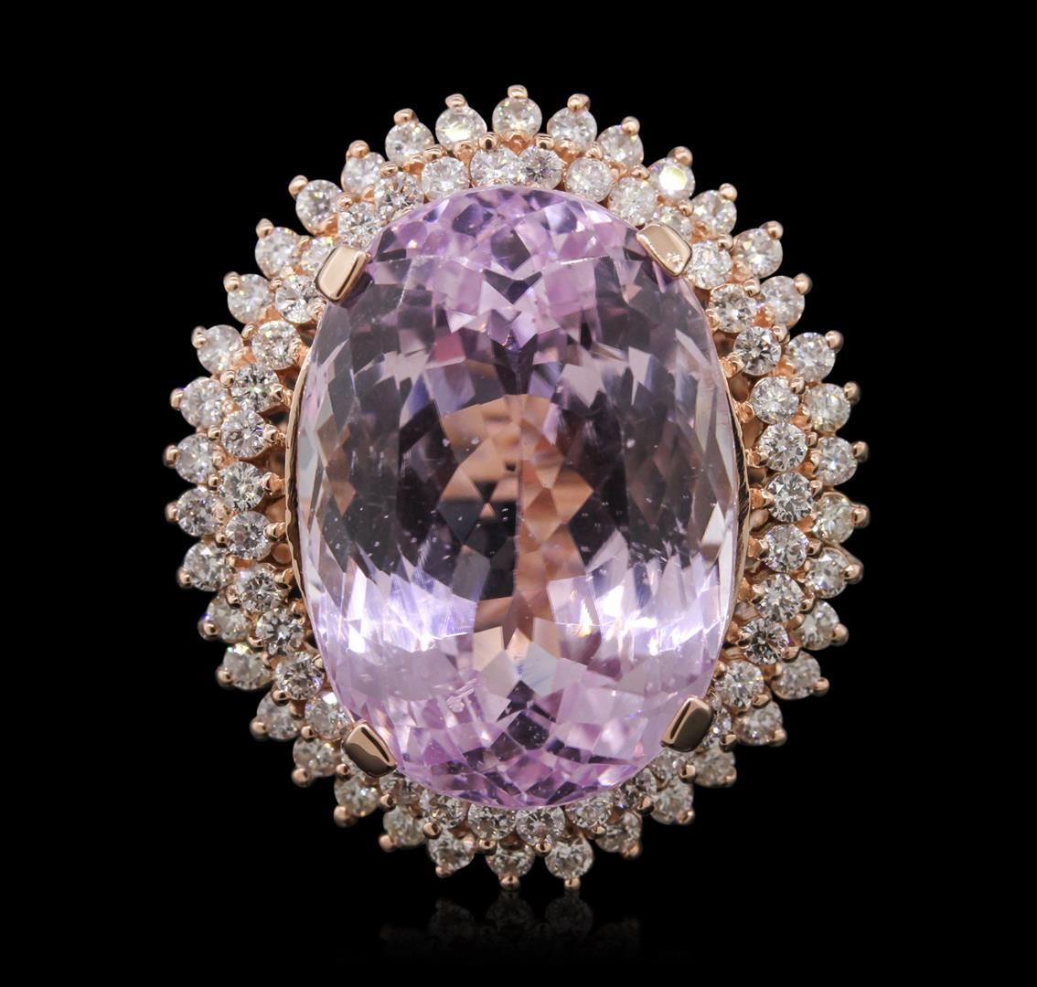 One electronically tested 14KT rose gold ladies cast kunzite and diamond ring with a bright polish finish. Condition is new, good workmanship. The featured kunzite is set within two stylized tiered diamond bezels supported by split shoulders, completed by a four millimeter wide band. Identified with markings of "K14". Containing: One prong set oval modified brilliant cut natural kunzite, measuring 23.29 x 16.31 x 13.19mm, exact weight 39.46ct., type I Clarity is slightly included, medium, very slightly grayish, Purple-Pink, (GIA PPi 5/3), cut is good. Transmitting light with no distortion, transparent. Naturally occurring internal & external characteristics are present. GIA Gemological Report attached. Graded loose prior to setting in the GIA Laboratory, Report #6157953494.Seventy-Three prong set round brilliant cut diamonds, measuring 1.90 - 1.80 x 1.11mm (depth est.) approximate. Total Weight of 73 Stones = 1.78ct. Graded in the setting. Clarity: SI-1 to I-1. Color: G - I. Total Weight of Colored Stones 39.46ct. Total Weight of Diamonds 1.78ct. Total Weight of Ring 19.46 grams. AIG Appraised at $19,015.00.