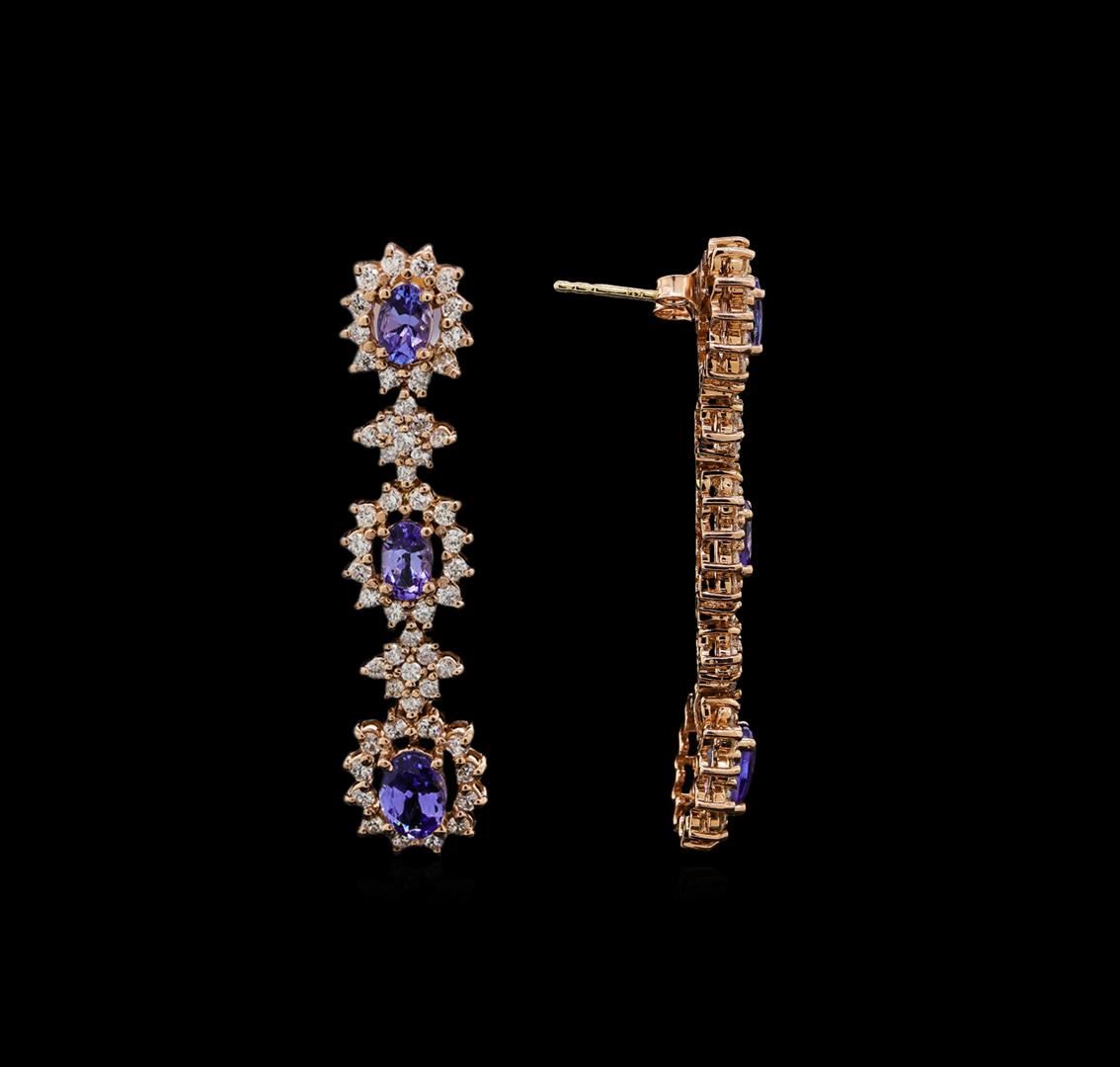 One pair electronically tested 14KT rose gold ladies cast tanzanite and diamond earrings with friction posts with a bright polish finish. Identified with markings of "14K". Condition is new. Containing: Six prong set oval modified brilliant cut natural tanzanites, measuring 7.20 x 5.10 x 3.32mm, approximate total weight of 5.16ct., clarity is eye clean, type I, medium light, very slightly grayish, violet color, (GIA V 4/3), cut is good. One Hundred Eight prong set round brilliant cut diamonds, measuring 1.50 - 1.50 x 0.90mm (depth est.) approximate total weight of 108 Stones = 1.33ct. Clarity: SI-1 to SI-2. Color: J - K, Cut is Good. Colored gemstones are presumed to have been subjected to commonly used enhancement processes. All diamonds and colored gemstones are graded in the mounting, unless otherwise stated. Total Weight of Colored Stones 5.16ct. Total Weight of Diamonds 1.33ct. Total Weight of Earrings 11.20 grams. GGL Appraised at $7,305.00.
