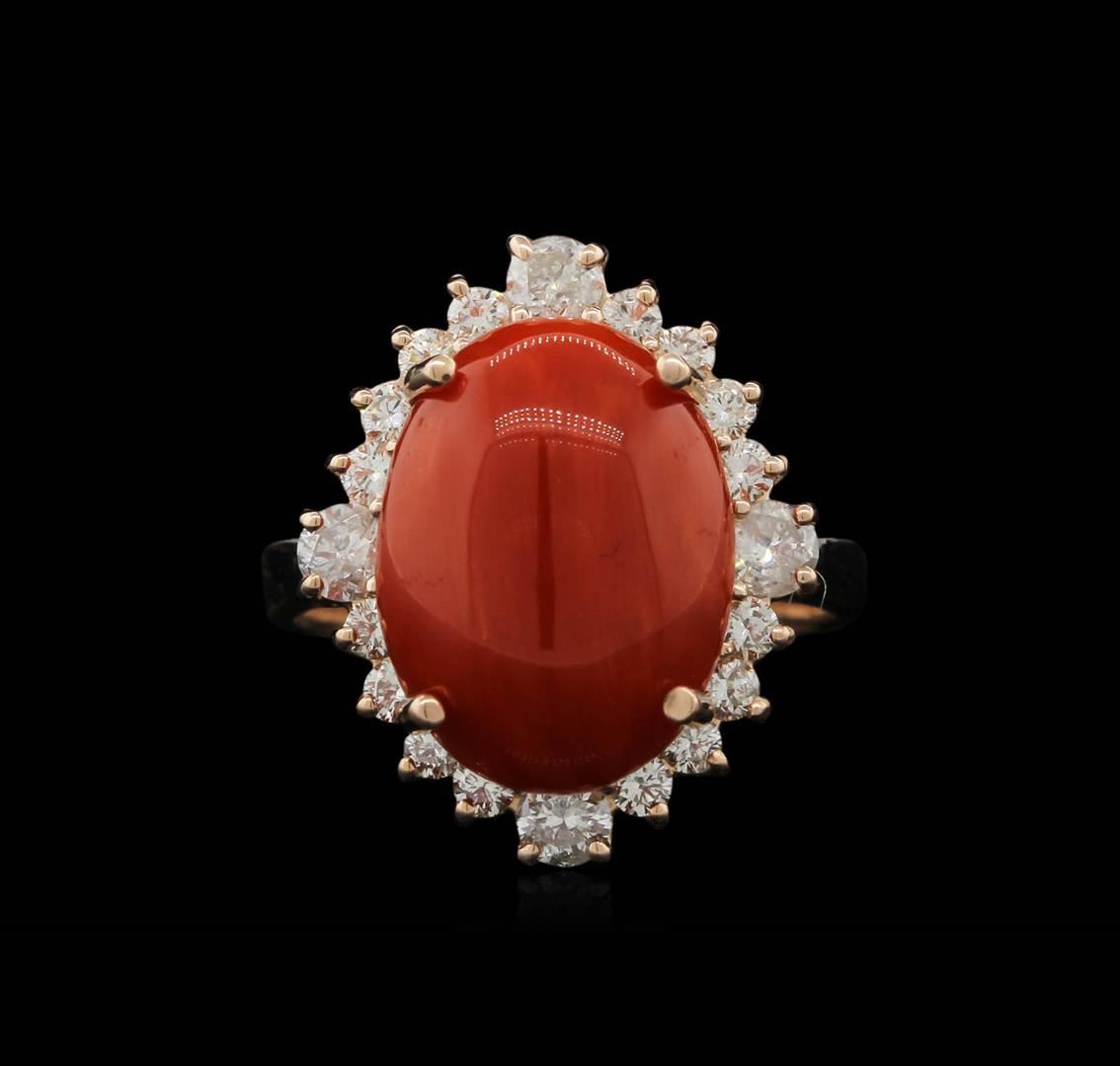 One electronically tested 14KT rose gold ladies cast coral and diamond ring with a bright polish finish. Condition is new, good workmanship. The featured coral is set within a diamond bezel, completed by a three millimeter wide band. Identified with markings of "K14". Containing: One prong set oval cabochon cut coral approximate weight of 6.09ct., dark, very slightly brownish, orangy red color (GIA oR 7/3), cut is good. Transmitting light very diffusely, opaque. Naturally occurring internal and external characteristics are present. Graded in the setting. Twenty prong set round brilliant cut diamonds approximate total weight of 20 Stones = 0.98ctw. Graded in the setting. Clarity SI-1 to I-1, Color H - J. Total weight of Colored Stones 6.09ct., Total Weight of Diamonds 0.98ct., Total Weight of Ring 7.38gm. AIG Appraised at $4,435.00.