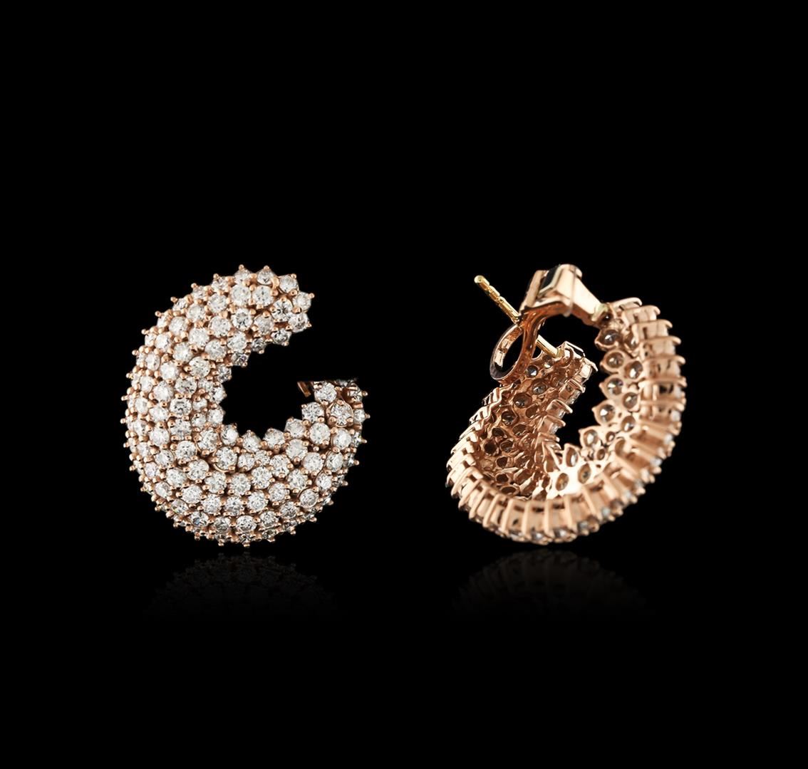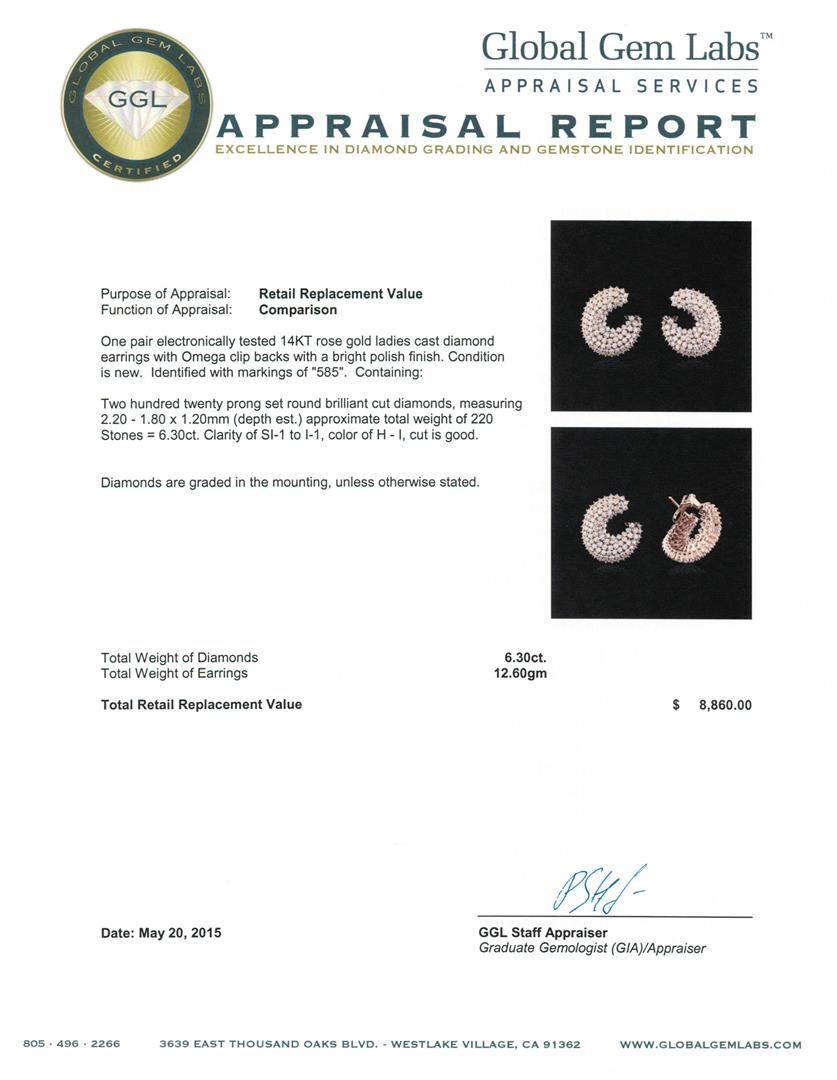 One pair electronically tested 14KT rose gold ladies cast diamond earrings with Omega clip backs with a bright polish finish. Identified with markings of "585". Condition is new. Containing: Two hundred twenty prong set round brilliant cut diamonds, measuring 2.20 - 1.80 x 1.20mm (depth est.) approximate total weight of 220 Stones = 6.30ct. Clarity: SI-1 to I-1. Color: H-I, Cut is Good. Diamonds are graded in the mounting, unless otherwise stated. Total Weight of Diamonds 6.30ct. Total Weight of Earrings 12.60 grams. GGL Appraised at $8,860.00.