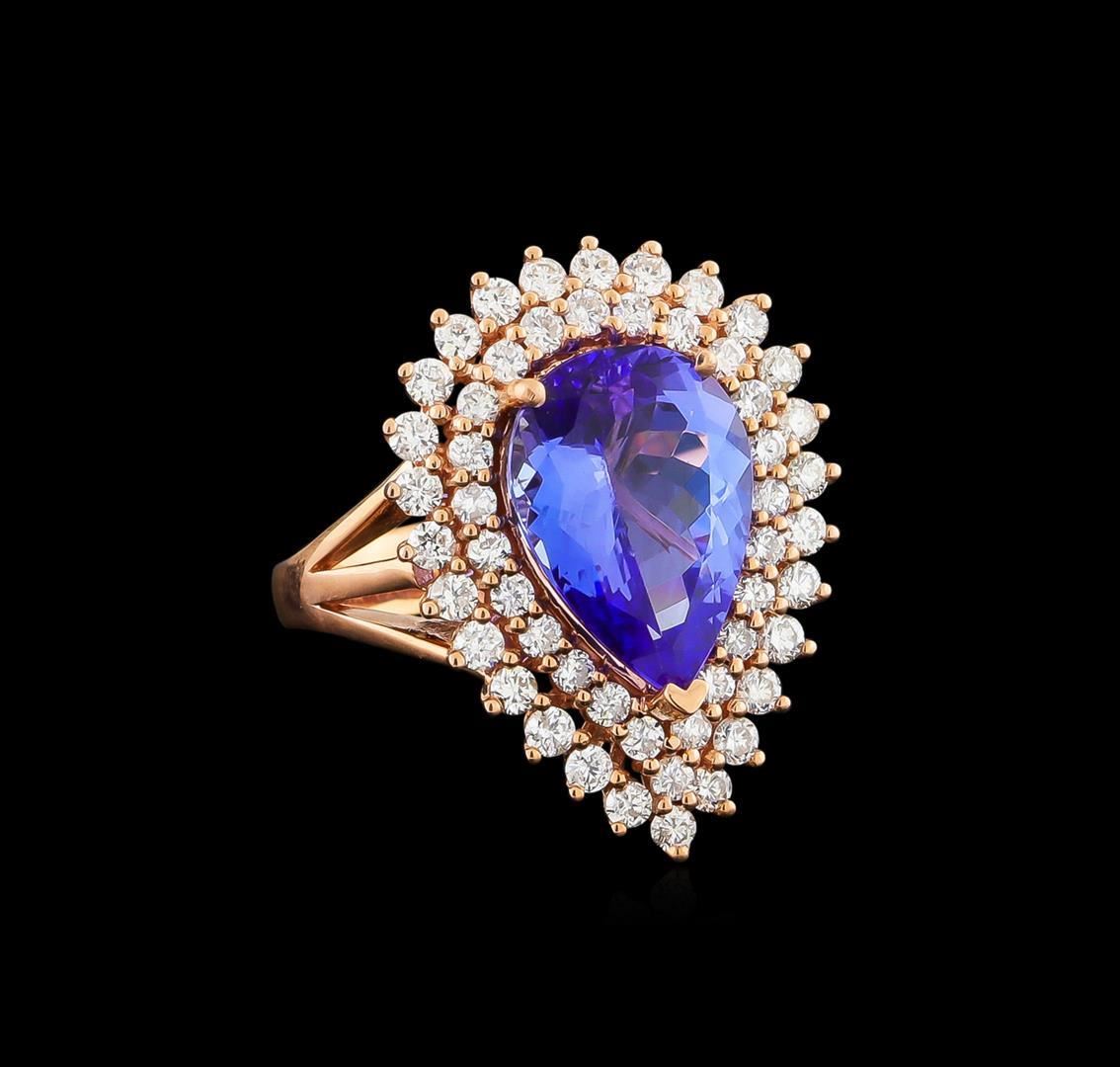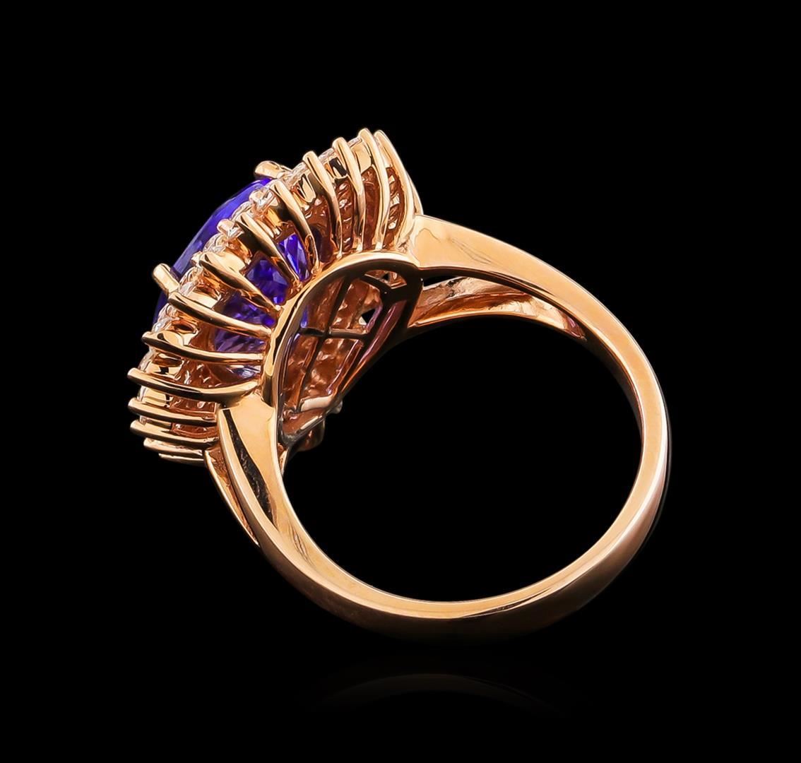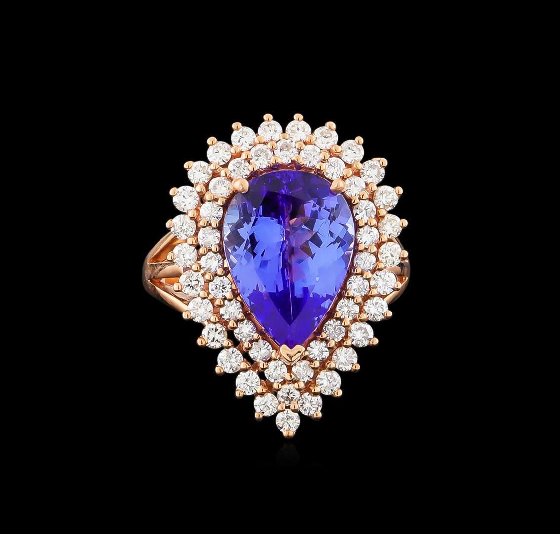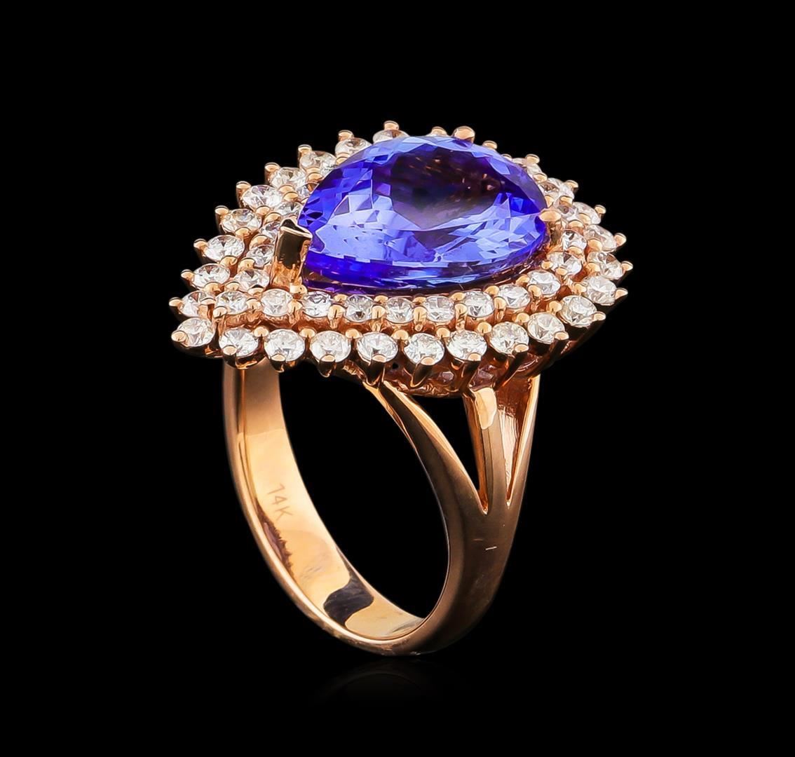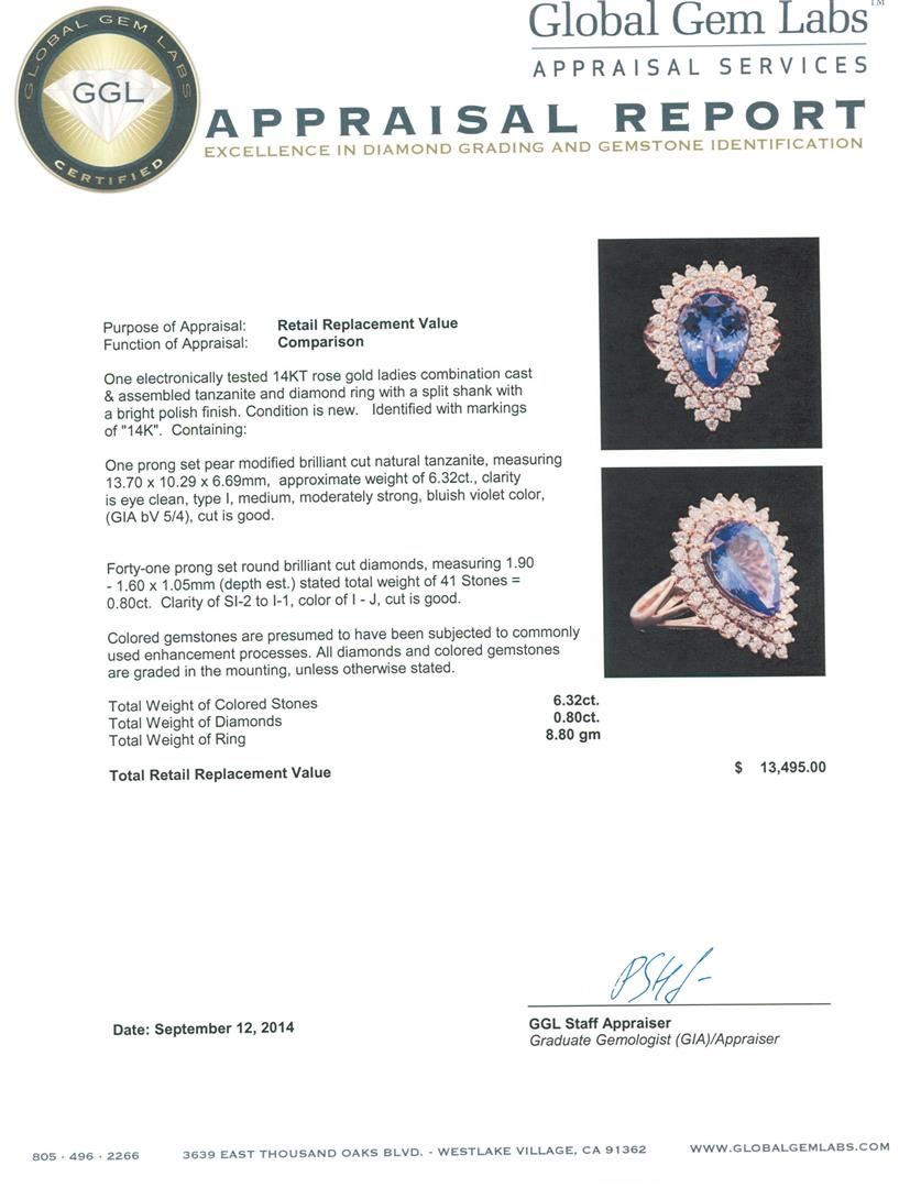 One electronically tested 14KT rose gold ladies combination cast & assembled tanzanite and diamond ring with a split shank with a bright polish finish. Identified with markings of "14K". Condition is new. Containing: One prong set pear modified brilliant cut natural tanzanite, measuring 13.70 x 10.29 x 6.69mm, approximate weight of 6.32ct., clarity is eye clean, type I, medium, moderately strong, bluish violet color, (GIA bV 5/4), cut is good. Forty-One prong set round brilliant cut diamonds, measuring 1.90 - 1.60 x 1.05mm (depth est.) stated total weight of 41 Stones = 0.80ct. Clarity: SI-2 to I-1. Color: I - J, Cut is Good. Colored gemstones are presumed to have been subjected to commonly used enhancement processes. All diamonds and colored gemstones are graded in the mounting, unless otherwise stated total weight of Colored Stones 6.32ct. Total Weight of Diamonds 0.80ct. Total Weight of Ring 8.80 grams. GGL Appraised.