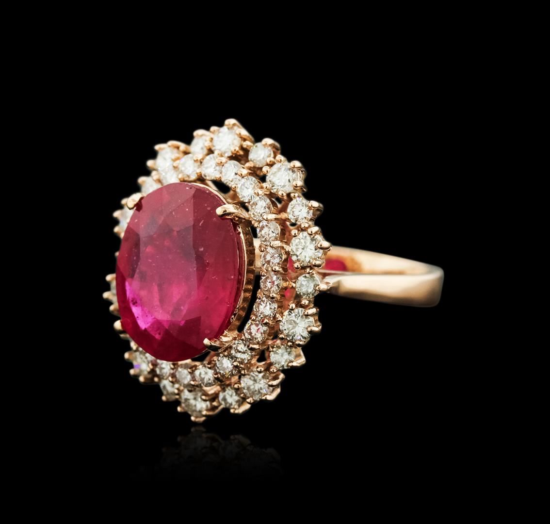 One electronically tested 14KT rose gold ladies cast ruby and diamond ring with a bright polish finish. Identified with markings of "14K". Condition is new. Containing: One prong set oval modified brilliant cut natural ruby, measuring 12.00 x 11.00 x 7.15mm, approximate weight of 6.64ct., clarity is heavily included, type II, medium light, very slightly brownish, slightly purplish red color, (GIA slpR 4/3), cut is good. Fifty-Four prong set round brilliant cut diamonds, measuring 2.50 - 1.50 x 1.20mm (depth est.) approximate total weight of 54 Stones = 1.58ct.. Clarity: SI-1 to SI-2. Color: I - J, Cut is Good. Colored gemstones are presumed to have been subjected to commonly used enhancement processes. All diamonds and colored gemstones are graded in the mounting, unless otherwise stated.. Total Weight of Colored Stones 6.64ct.. Total Weight of Diamonds 1.58ct.. Total Weight of Ring 7.10 grams. GGL Appraised.