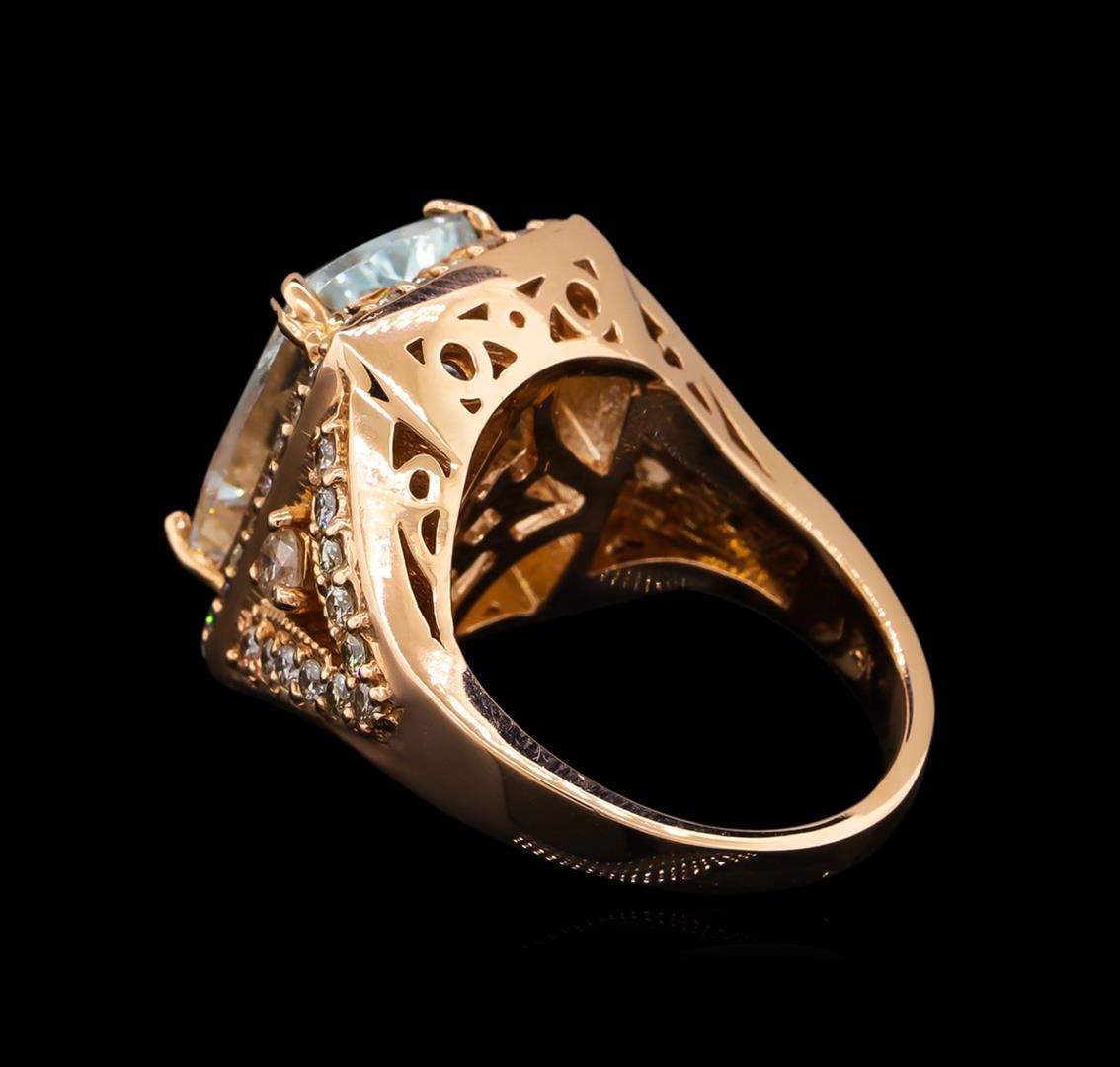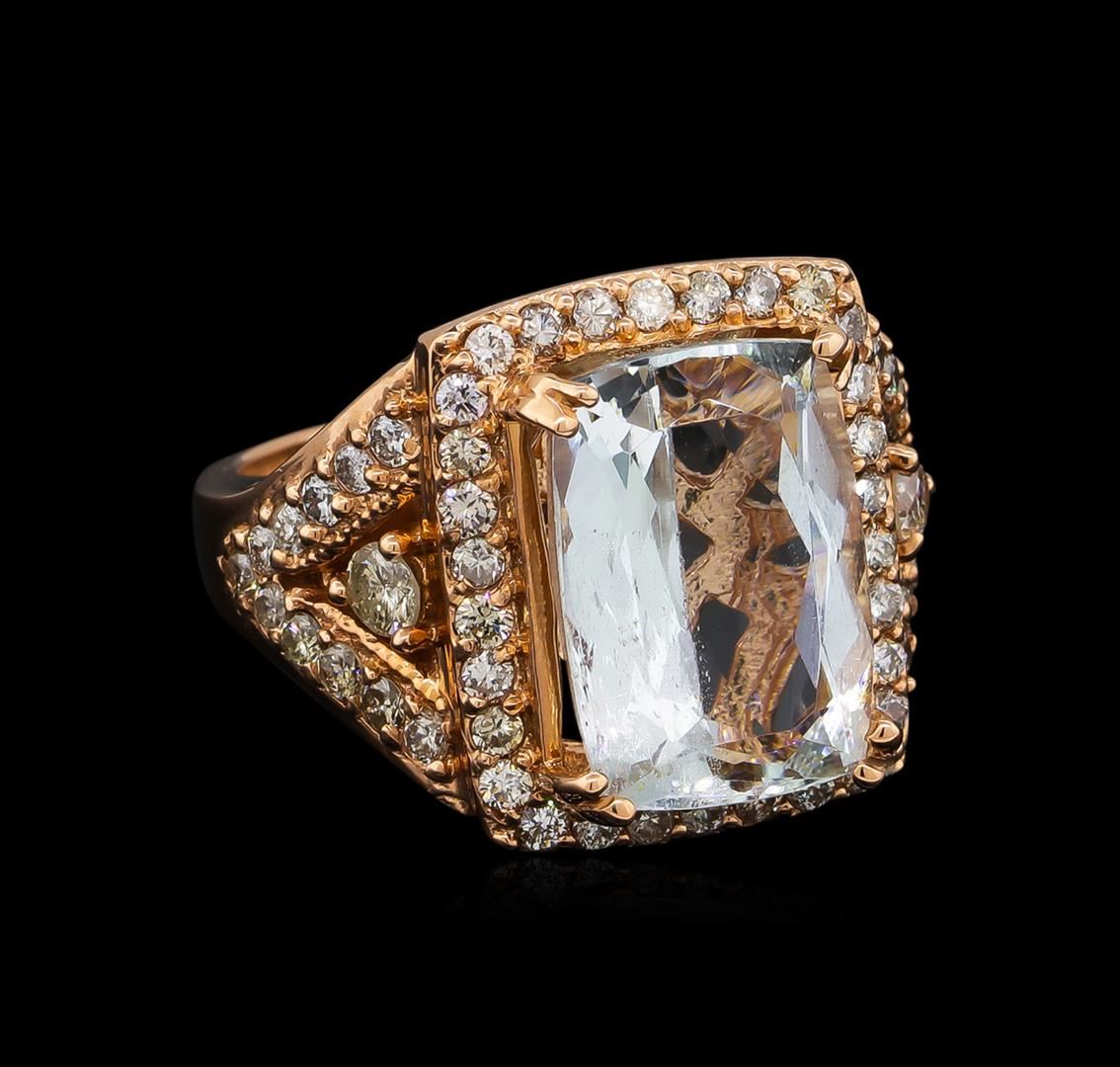 One electronically tested 14KT rose gold ladies cast aquamarine and diamond ring. The featured aquamarine is set within a diamond bezel supported by elaborate diamond set shoulders, completed by a two and one-half millimeter wide band. Bright polish finish with milgrain detailing. Trademark is SA. Identified with markings of "14K". Condition is new, good workmanship. Containing: One prong set rectangular cushion mixed cut natural aquamarine, measuring 14.50 x 10.20 x 7.65mm, 10%. bulge factor, approximate weight of 7.96ct., clarity is slightly included, type I, medium light, very slightly grayish, very slightly greenish blue color, (GIA vslgB 4/3), cut is good. Transmitting light with no distortion, transparent. Naturally occurring internal & external characteristics are present. Colored Stone Grading Report attached. Graded in the setting. Two prong set round brilliant cut diamonds, measuring 3.20 - 3.10 x 1.89mm (depth est.) approximate. Total Weight of 2 Stones = 0.25ct. Graded in the setting. Clarity: I-1. Color: H - I Fifty-Two prong set round brilliant cut diamonds, measuring 1.80 - 1.70 x 1.05mm (depth est.) approximate. Total Weight of 52 Stones = 1.12ct. Faint brown secondary color throughout. Graded in the setting. Clarity: SI-1 to I-1. Color: I - K. Total Weight of Colored Stones 7.96ct. Total Weight of Diamonds 1.37ct. AIG Appraised.