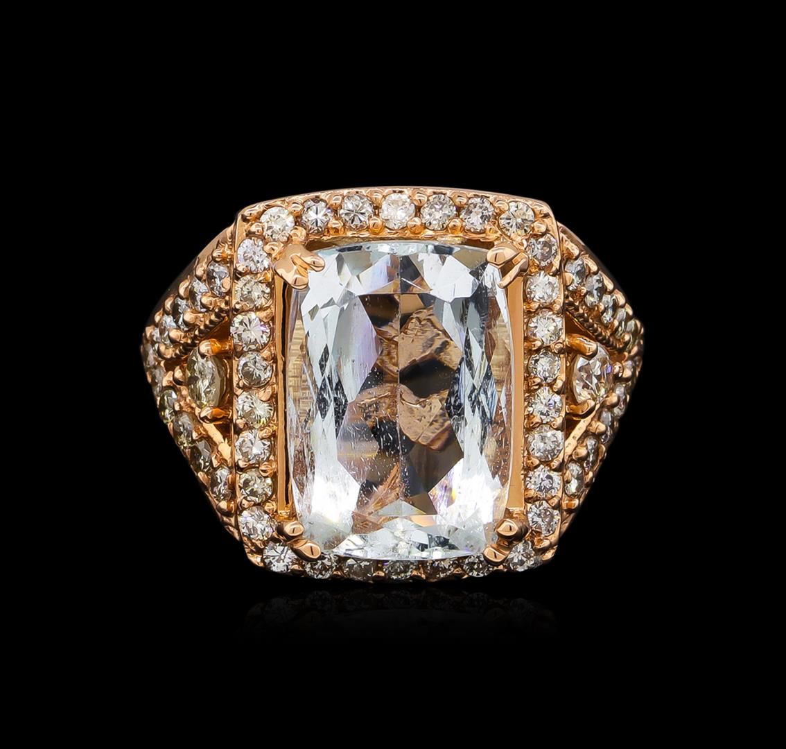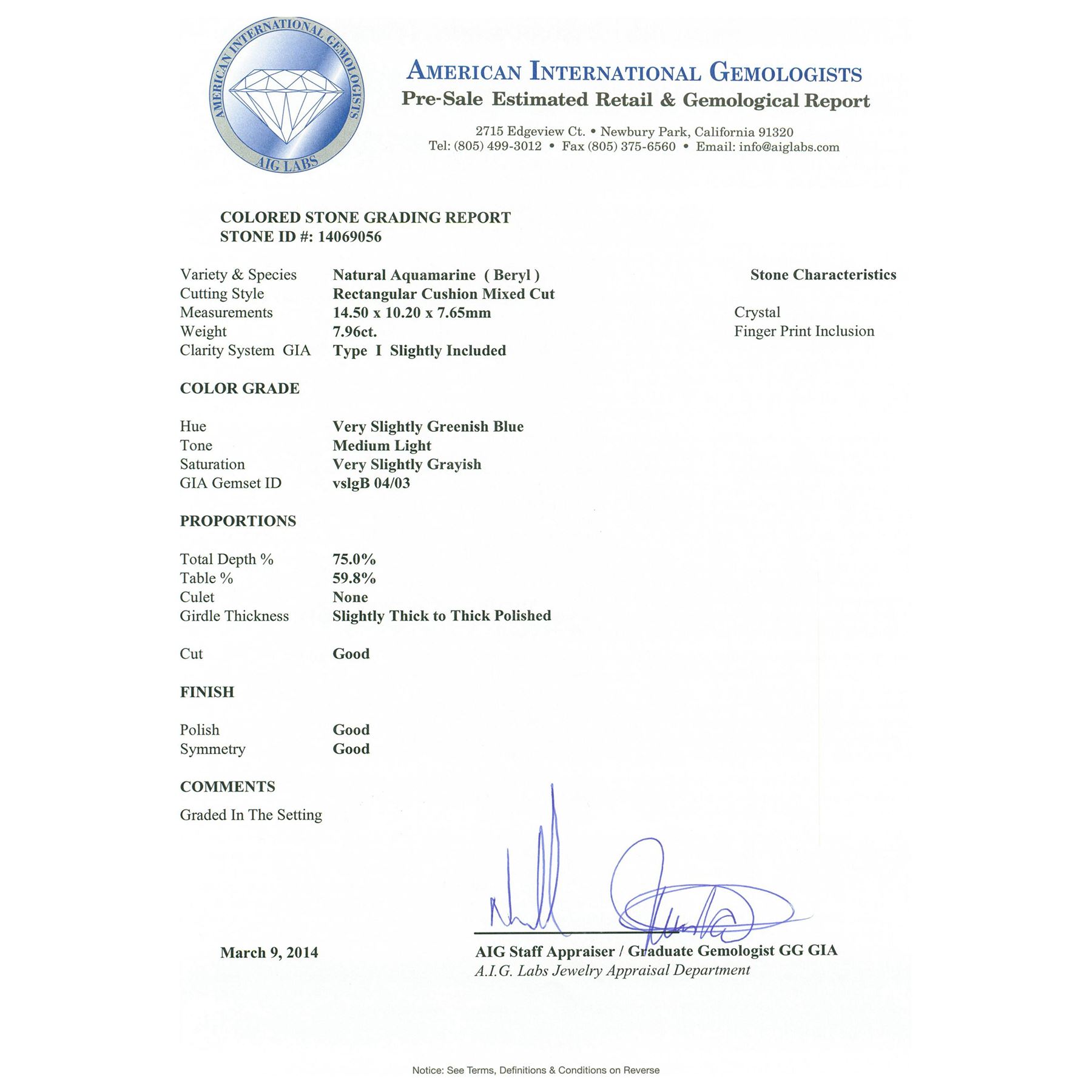 One electronically tested 14KT rose gold ladies cast aquamarine and diamond ring. The featured aquamarine is set within a diamond bezel supported by elaborate diamond set shoulders, completed by a two and one-half millimeter wide band. Bright polish finish with milgrain detailing. Trademark is SA. Identified with markings of "14K". Condition is new, good workmanship. Containing: One prong set rectangular cushion mixed cut natural aquamarine, measuring 14.50 x 10.20 x 7.65mm, 10%. bulge factor, approximate weight of 7.96ct., clarity is slightly included, type I, medium light, very slightly grayish, very slightly greenish blue color, (GIA vslgB 4/3), cut is good. Transmitting light with no distortion, transparent. Naturally occurring internal & external characteristics are present. Colored Stone Grading Report attached. Graded in the setting. Two prong set round brilliant cut diamonds, measuring 3.20 - 3.10 x 1.89mm (depth est.) approximate. Total Weight of 2 Stones = 0.25ct. Graded in the setting. Clarity: I-1. Color: H - I Fifty-Two prong set round brilliant cut diamonds, measuring 1.80 - 1.70 x 1.05mm (depth est.) approximate. Total Weight of 52 Stones = 1.12ct. Faint brown secondary color throughout. Graded in the setting. Clarity: SI-1 to I-1. Color: I - K. Total Weight of Colored Stones 7.96ct. Total Weight of Diamonds 1.37ct. AIG Appraised.