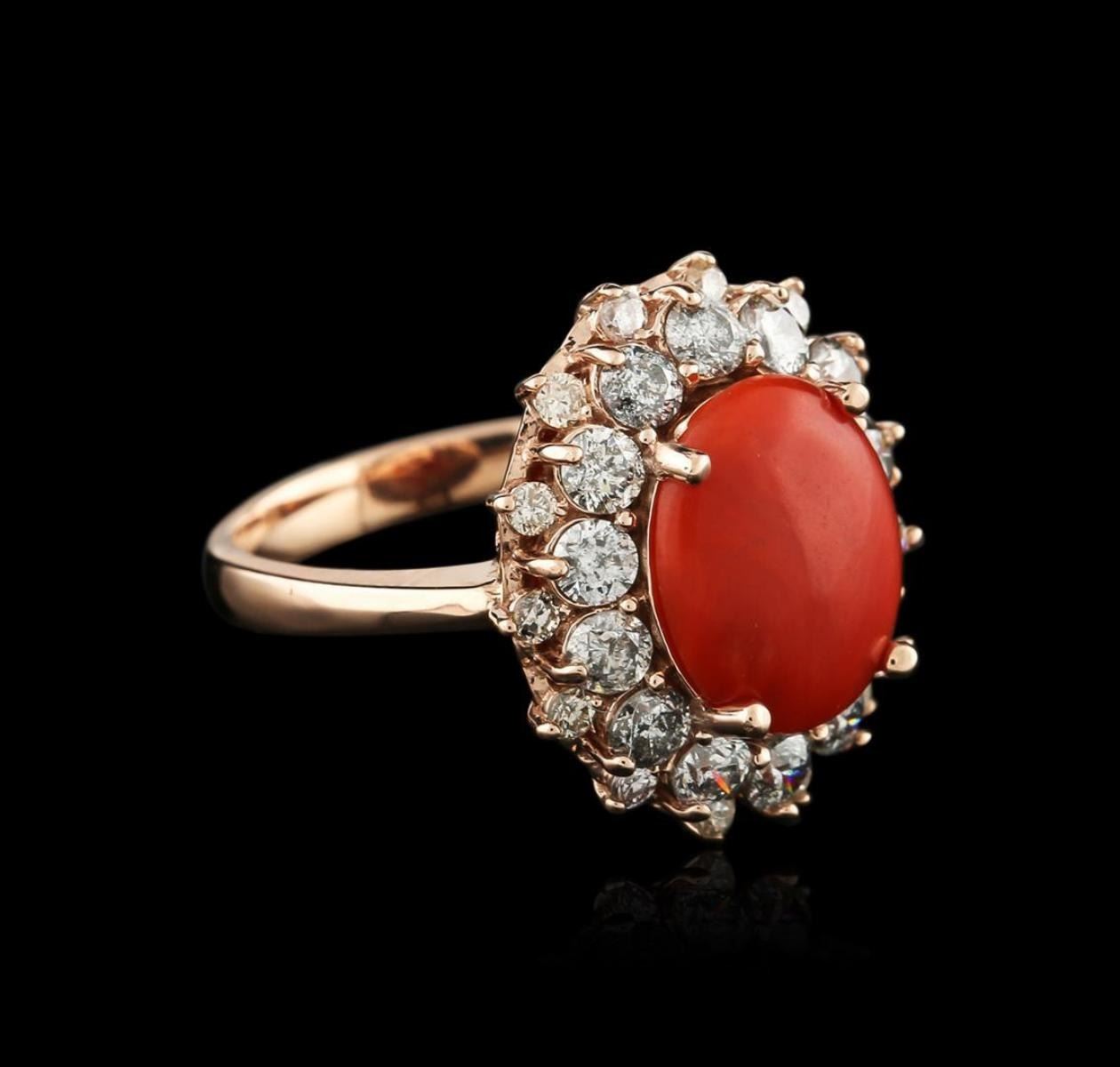 One electronically tested 14KT rose gold ladies cast coral and diamond ring with a bright polish finish. Identified with markings of "K14". Condition is new. Containing: Fourteen prong set round brilliant cut diamonds, measuring 2.90 - 2.90 x 1.74mm (depth est.) approximate total weight of 14 Stones = 1.25ct. Clarity: I-2 to I-3. Color: H - I, Cut is Good. Fourteen prong set round brilliant cut diamonds, measuring 1.70 - 1.50 x 0.96mm (depth est.) approximate total weight of 14 Stones = 0.21ct. Clarity: I-1 to I-2. Color: I - J, Cut is Good. Diamonds and colored gemstones are graded in the mounting, unless otherwise stated. Colored gemstones are presumed to have been subjected to commonly used enhancement processes. One prong set oval cabochon cut natural red coral, measuring 12.50 x 10.00 x 6.50mm, approximate weight of 8.88ct., clarity is heavily included, medium dark, brownish, red color, (GIA R 6/1), cut is good. Total Weight of Colored Stones 8.88ct. Total Weight of Diamonds 1.46ct. Total Weight of Ring 7.20 grams. GGL Appraised.