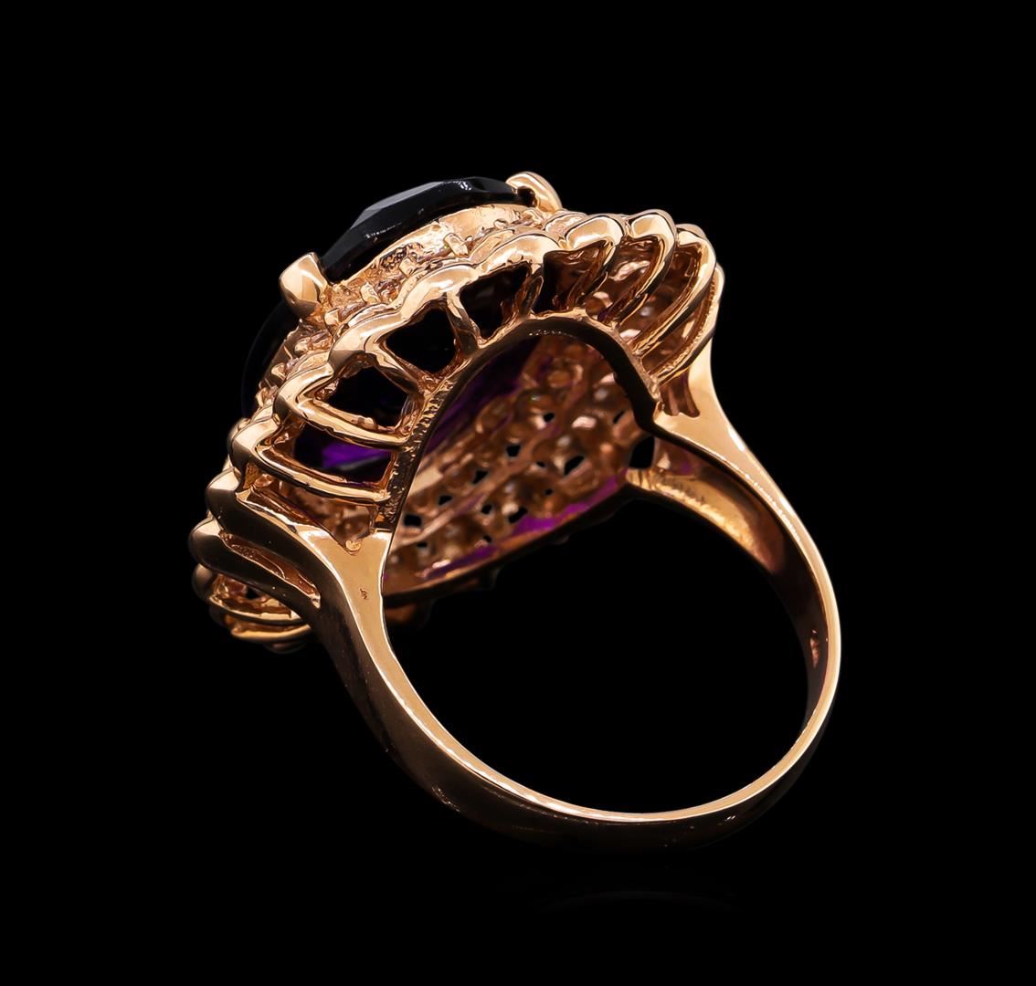One electronically tested 14KT rose gold Ladies combination cast & assembled ring with a high polish finish. Condition is new. Identified with markings of "K14". Containing: One prong set oval modified mixed cut natural amethyst, measuring 18.00 x 13.00 x 7.15mm, approximate weight of 9.45ct., clarity is eye clean, type II, medium dark, moderately strong, purple color, (GIA P 6/4), cut is good. Colored gemstones are presumed to have been subjected to commonly used color/clarity enhancement processes. Twenty-Two prong set round brilliant cut diamonds, measuring 1.10 - 1.10 x 0.66mm (depth est.) approximate. Total Weight of 22 Stones = 0.15ct. Clarity: I-1 to I-2. Color: I - J, Cut is Good. Thirty-One prong set round brilliant cut diamonds, measuring 1.60 - 1.60 x 0.96mm (depth est.) approximate. Total Weight of 31 Stones = 0.55ct. Clarity: SI-2 to I-1. Color: H - I, Cut is Good. Total Weight of Colored Stones 9.45ct. Total Weight of Diamonds 0.70 ct. Total Weight of Ring 9.60 grams. GGL Appraised.