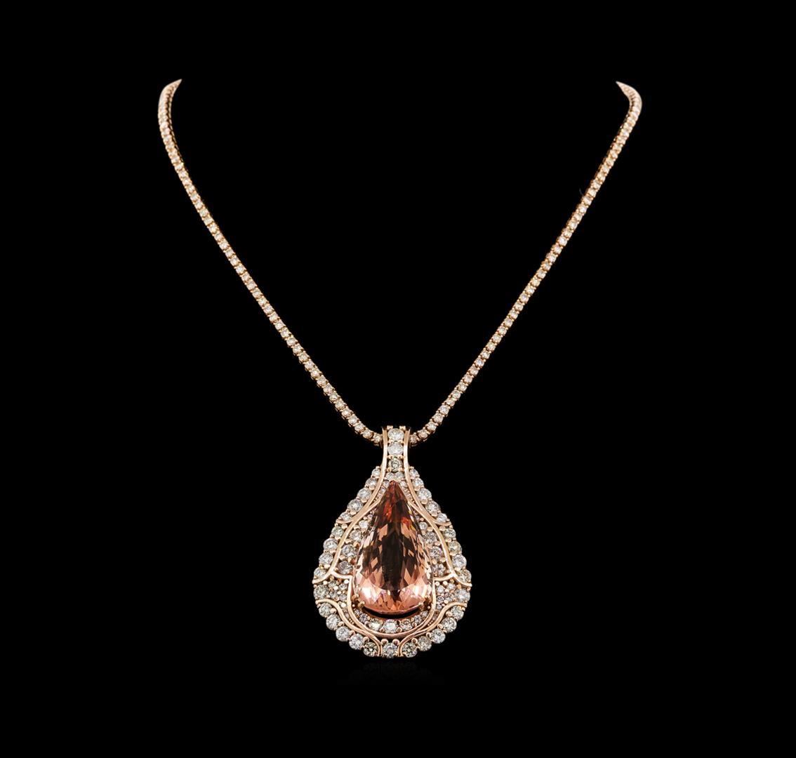One electronically tested 14KT rose gold ladies cast & assembled morganite and diamond pendant with chain. The pendant features a morganite set within an elaborate diamond gallery, completed by a diamond set bail. The pendant is supported by a seventeen and one-quarter inch length flexible diamond chain, terminating in a hidden clasp with safety bar. Bright polish finish. Condition is new, good workmanship. Containing: One prong set pear modified brilliant cut natural morganite, measuring 34.71 x 19.04 x 13.62mm, exact weight 49.49ct., type I Clarity is eye clean, medium dark, very slightly brownish, pinkish orange color, (GIA piO 6/3), cut is good. Transmitting light with no distortion, transparent. GIA Gemological Report attached. Graded loose prior to setting in the GIA Laboratory, Report #2151952518.Thirty-Three prong set round brilliant cut diamonds, measuring 3.90 - 3.40 x 2.19mm (depth est.) approximate total weight of 33 Stones = 5.90ct. Graded in the setting. Clarity: SI-1 to I-1. Color: H - J Eighteen prong set round brilliant cut diamonds, measuring 2.30 - 1.90 x 1.26mm (depth est.) approximate total weight of 18 Stones = 0.65ct. Graded in the setting. Clarity: SI-1 to I-1. Color: H - J Twenty-Four prong set round brilliant cut diamonds, measuring 1.60 - 1.20 x 0.84mm (depth est.) approximate total weight of 24 Stones = 0.30ct. Graded in the setting. Clarity: SI-1 to I-1. Color: H - J One Hundred Fifty-Six prong set round brilliant cut diamonds, measuring 2.20 - 2.10 x 1.29mm (depth est.) approximate total weight of 156 Stones = 5.76ct. Graded in the setting. Clarity: SI-1 to I-1. Color: H - J. Total Weight of Colored Stones 49.49ct. Total Weight of Diamonds 12.61ct. Total Weight of Pendant With Chain 57.41 grams. AIG Appraised.