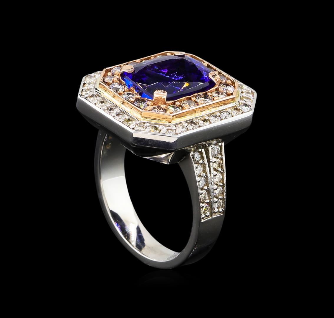 One electronically tested 14KT rose and white gold Ladies combination cast & assembled ring with a bright polish finish. Condition is new. Identified with markings of "14K". Containing: One prong set rectangular cushion modified brilliant cut natural tanzanite, measuring 10.20 x 8.49 x 6.30mm, approximate weight of 4.29ct., clarity is eye clean, type I, medium, moderately strong, violetish blue color, (GIA vB 5/4), cut is very good. Colored gemstones are presumed to have been subjected to commonly used color/clarity enhancement processes. Thirty-Five prong set round brilliant cut diamonds, measuring 1.30 - 1.30 x 0.78mm (depth est.) approximate. Total Weight of 35 Stones = 0.35ct. Clarity: I-1 to I-2. Color: I - J, Cut is Good. Eighteen prong set round brilliant cut diamonds, measuring 1.80 - 1.80 x 1.08mm (depth est.) approximate. Total Weight of 18 Stones = 0.38ct. Clarity: I-1 to I-2. Color: I - J, Cut is Good. Total Weight of Colored Stones 4.29ct. Total Weight of Diamonds 0.73ct. Total Weight of Ring 11.30 grams. GGL Appraised.