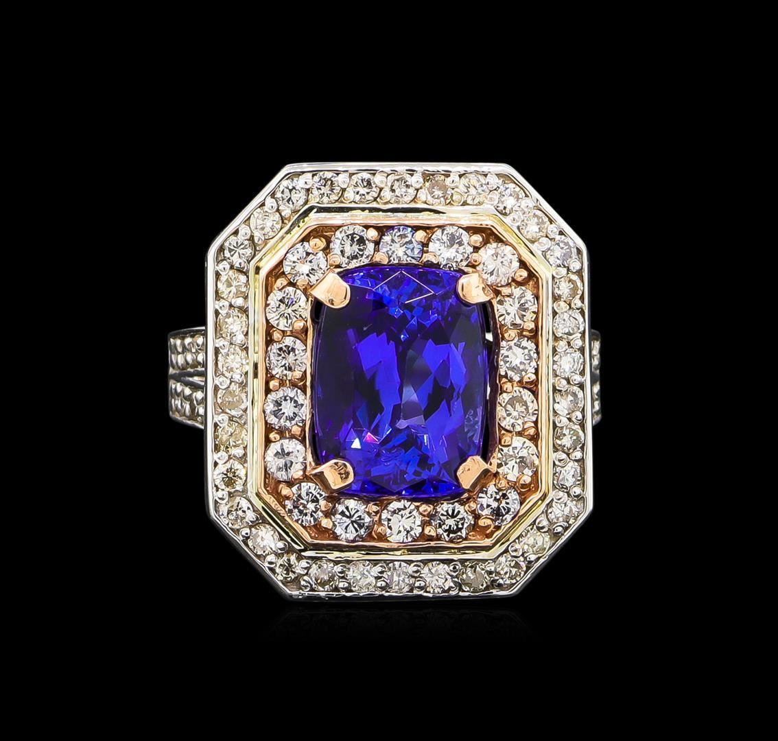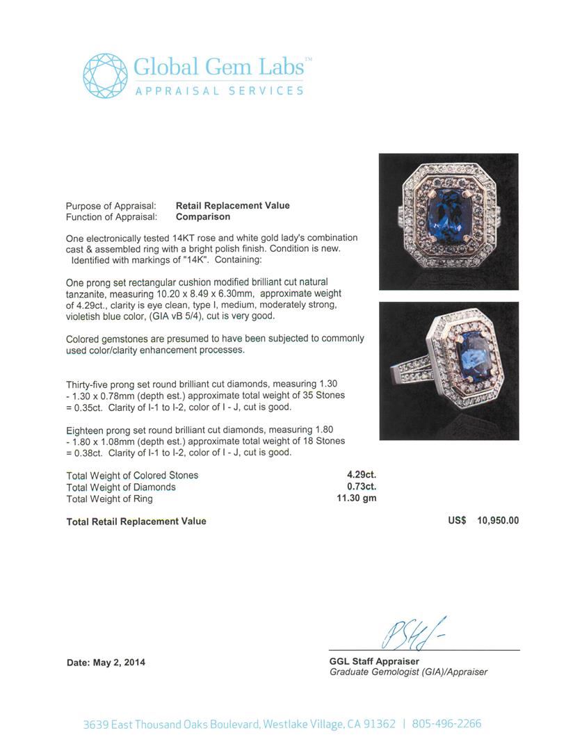 One electronically tested 14KT rose and white gold Ladies combination cast & assembled ring with a bright polish finish. Condition is new. Identified with markings of "14K". Containing: One prong set rectangular cushion modified brilliant cut natural tanzanite, measuring 10.20 x 8.49 x 6.30mm, approximate weight of 4.29ct., clarity is eye clean, type I, medium, moderately strong, violetish blue color, (GIA vB 5/4), cut is very good. Colored gemstones are presumed to have been subjected to commonly used color/clarity enhancement processes. Thirty-Five prong set round brilliant cut diamonds, measuring 1.30 - 1.30 x 0.78mm (depth est.) approximate. Total Weight of 35 Stones = 0.35ct. Clarity: I-1 to I-2. Color: I - J, Cut is Good. Eighteen prong set round brilliant cut diamonds, measuring 1.80 - 1.80 x 1.08mm (depth est.) approximate. Total Weight of 18 Stones = 0.38ct. Clarity: I-1 to I-2. Color: I - J, Cut is Good. Total Weight of Colored Stones 4.29ct. Total Weight of Diamonds 0.73ct. Total Weight of Ring 11.30 grams. GGL Appraised.