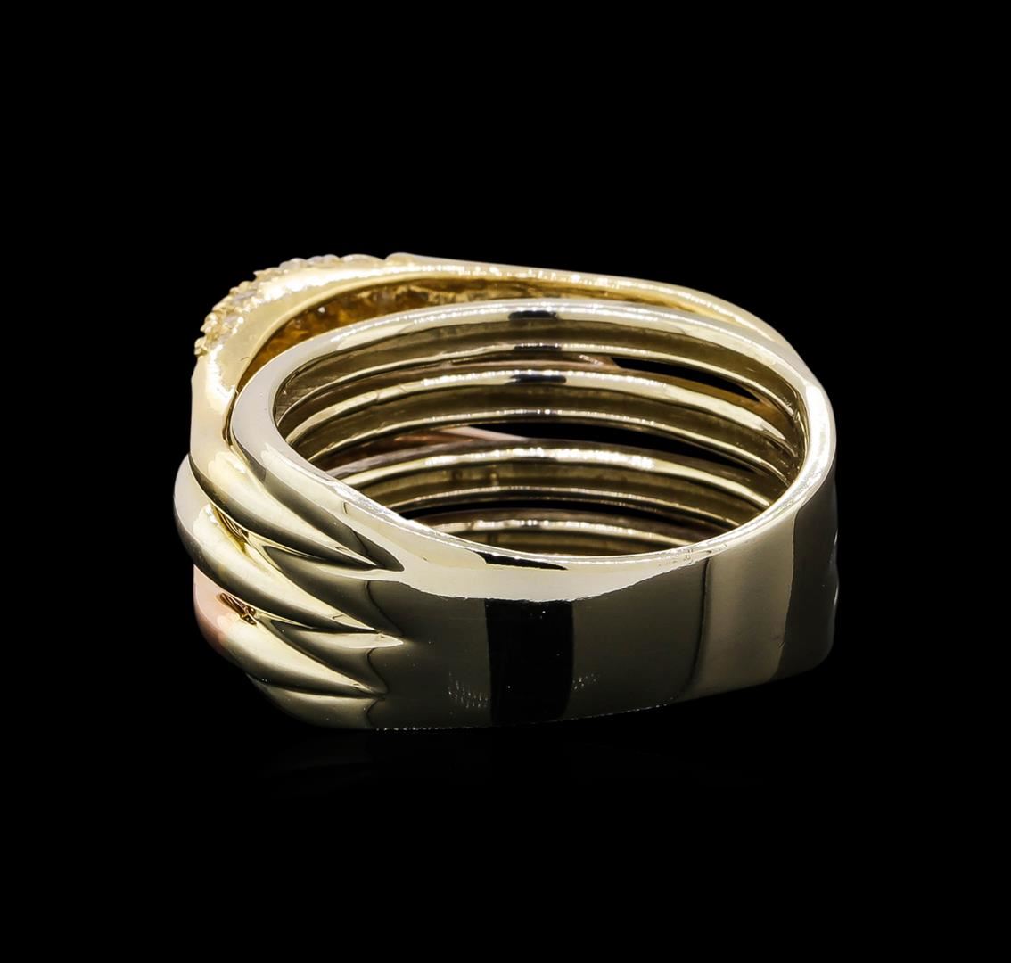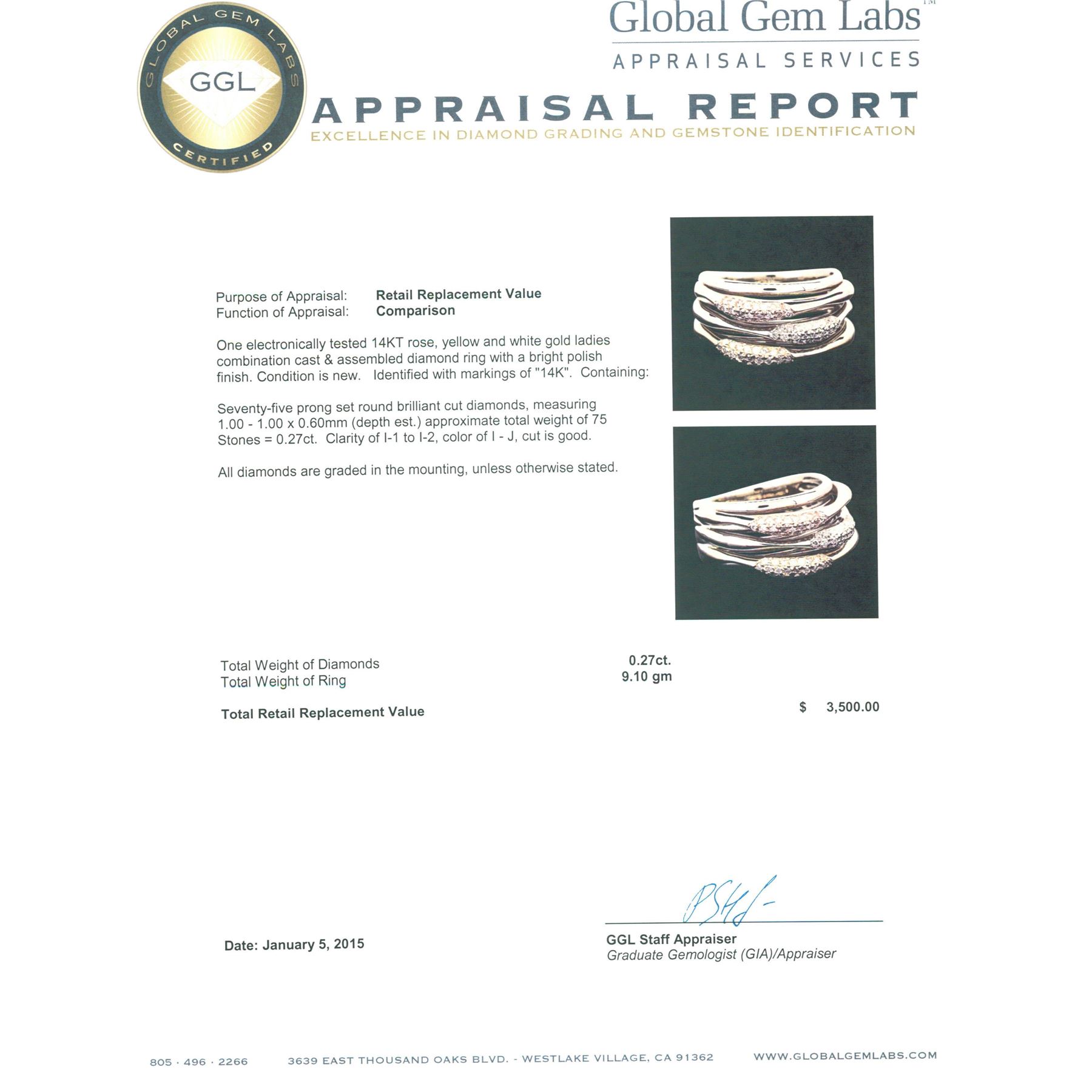 One electronically tested 14KT rose, yellow and white gold ladies combination cast & assembled diamond ring with a bright polish finish. Identified with markings of "14K". Condition is new. Containing: Seventy-Five prong set round brilliant cut diamonds, measuring 1.00 - 1.00 x 0.60mm (depth est.) approximate total weight of 75 Stones = 0.27ct. Clarity: I-1 to I-2. Color: I - J, Cut is Good. All diamonds are graded in the mounting, unless otherwise stated. Total Weight of Diamonds 0.27ct. Total Weight of Ring 9.10 grams. GGL Appraised.