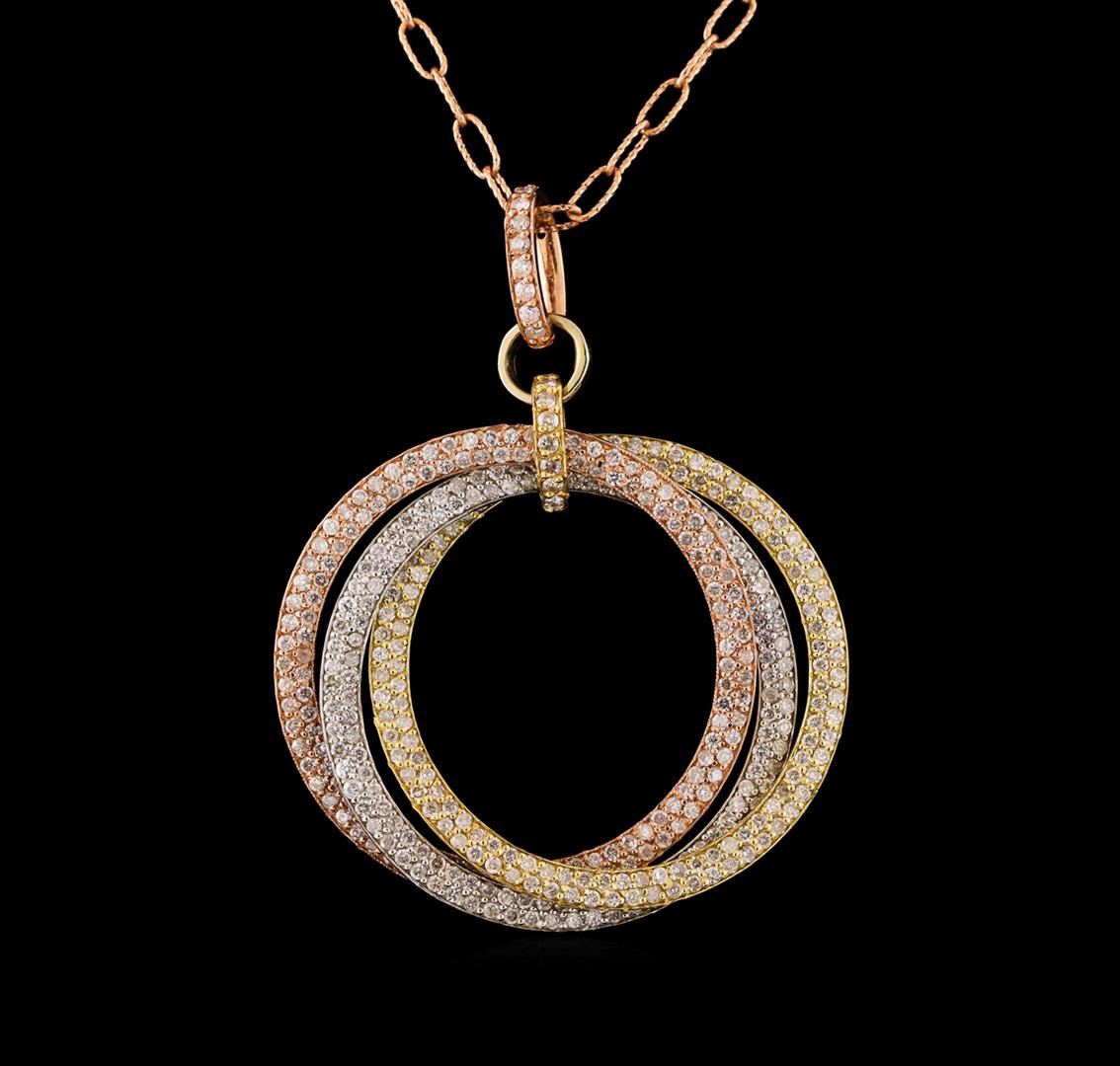 One electronically tested 14KT rose, yellow and white gold ladies combination cast & assembled diamond pendant & chain 18.0" long, figaro link with a lobster claw clasp with a bright polish finish. Identified with markings of "K14". Condition is new. Containing: Four Hundred Eight prong set round brilliant cut diamonds, measuring 1.00 - 1.00 x 0.60mm (depth est.) approximate total weight of 408 Stones = 1.47ct. Clarity: I-2 to I-3. Color: J - K. Eight prong set round brilliant cut diamonds, measuring 1.30 - 1.30 x 0.78mm (depth est.) approximate total weight of 8 Stones = 0.06ct. Clarity: I-2 to I-3. Color: I - J. All diamonds are graded in the mounting, unless otherwise stated. Total Weight of Diamonds 1.53ct. Total Weight of Pendant & Chain 15.70 grams. GGL Appraised.