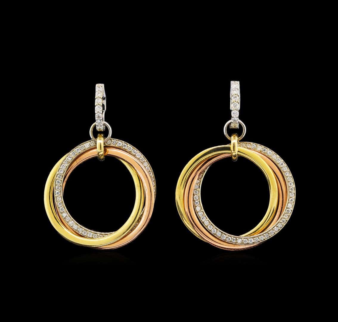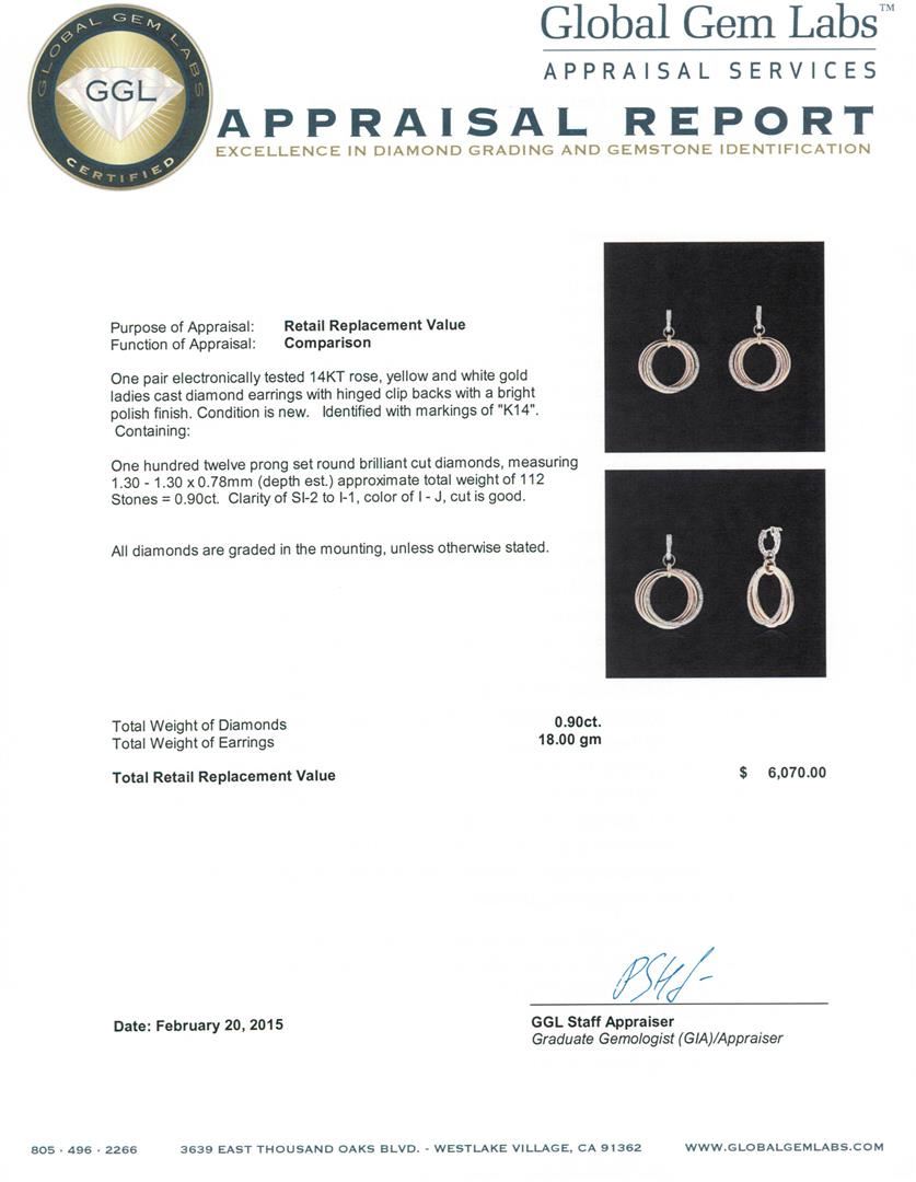 One pair electronically tested 14KT rose, yellow and white gold ladies cast diamond earrings with hinged clip backs with a bright polish finish. Identified with markings of "K14". Condition is new. Containing: One Hundred Twelve prong set round brilliant cut diamonds, measuring 1.30 - 1.30 x 0.78mm (depth est.) approximate total weight of 112 Stones = 0.90ct. Clarity: SI-2 to I-1. Color: I - J, Cut is Good. All diamonds are graded in the mounting, unless otherwise stated. Total Weight of Diamonds 0.90ct. Total Weight of Earrings 18.00 grams. GGL Appraised at $6,070.00.