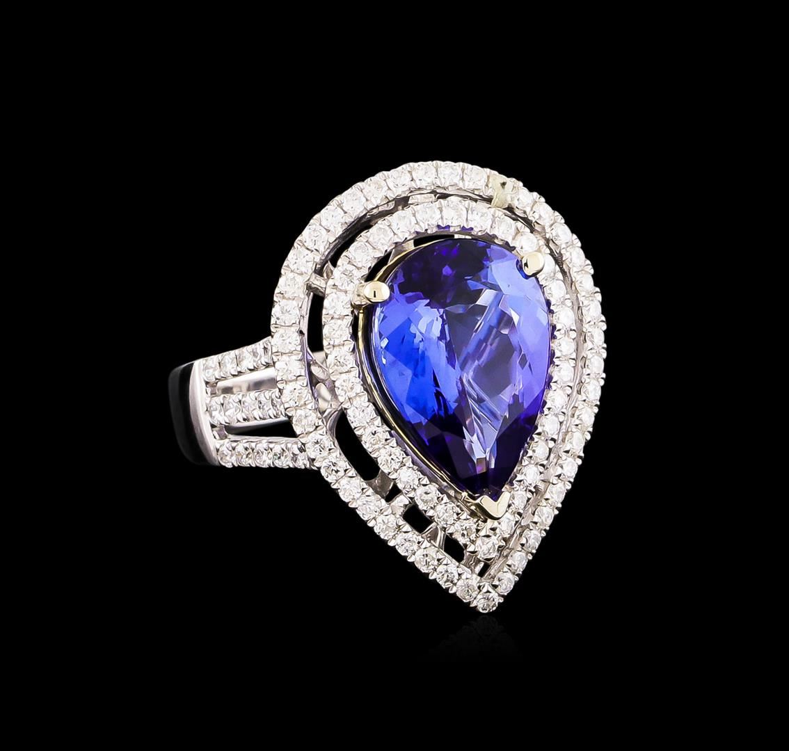 One electronically tested 14KT white and yellow gold Ladies combination cast & assembled ring with a bright polish finish. Condition is new. Identified with markings of "14K". Containing: One prong set pear modified brilliant cut natural tanzanite, measuring 14.00 x 9.40 x 6.11mm, approximate weight of 5.39ct., clarity is eye clean, type I, medium, moderately strong, bluish violet color, (GIA bV 5/4), cut is good. One Hundred Twelve prong set round brilliant cut diamonds, measuring 1.30 - 1.30 x 0.78mm (depth est.) approximate total weight of 112 Stones = 0.90ct. Clarity: I-1 to I-2. Color: H - I, Cut is Good. Colored gemstones are presumed to have been subjected to commonly used enhancement processes. All diamonds and colored gemstones are graded in the mounting, unless otherwise stated. Total Weight of Colored Stones 5.39ct. Total Weight of Diamonds 0.90ct. Total Weight of Ring 8.10 grams. GGL Appraised at $11,450.00.