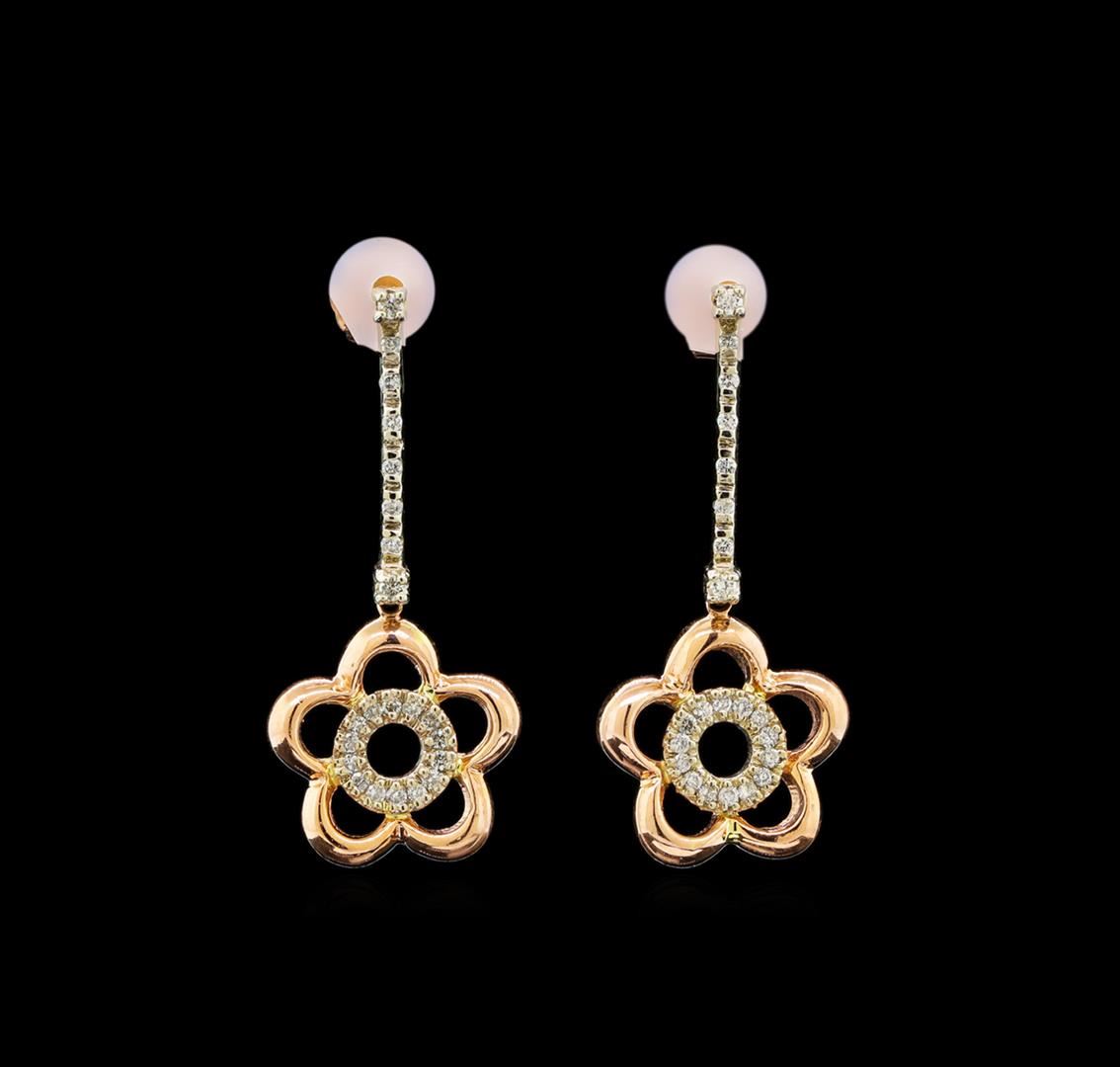 One pair electronically tested 14KT white and rose gold ladies cast diamond earrings with friction posts with a bright polish finish. Identified with markings of "14K". Condition is new. Containing: Forty-Four prong set round brilliant cut diamonds, measuring 0.90 - 0.90 x 0.54mm (depth est.) approximate total weight of 44 Stones = 0.11ct. Clarity: SI-1 to SI-2. Color: I - J, Cut is Good. All diamonds are graded in the mounting, unless otherwise stated. Total Weight of Diamonds 0.11ct. Total Weight of Earrings 4.90 grams. GGL Appraised.