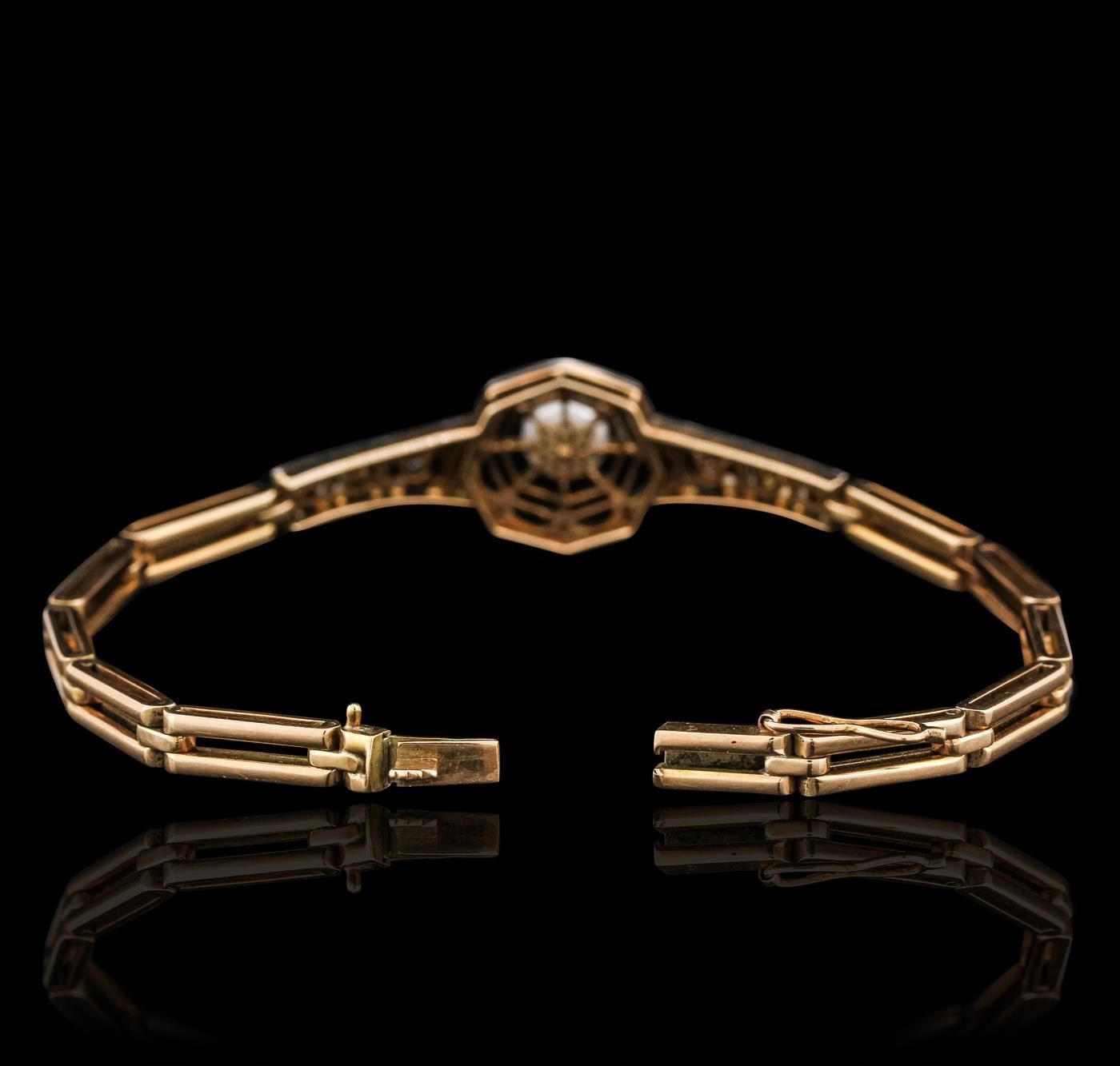 One electronically tested 14KT rose and white gold ladies hand assembled antique bracelet with a hidden box clasp with safety closer with a antiqued finish. Measurements: 7.50" in length. Condition is very good. Containing: One akoya cultured pearl, 6.5mm in size to 6.5mm in size. The pearl is white in color with a good luster, acceptable nacre, near round to off round, moderately blemished. Six gypsy set transitional cut diamonds, measuring 2.00 - 1.50 x 0.93mm (depth est.) approximate total weight of 6 Stones = 0.10 ct. Clarity: SI-2 to I-1. Color: I - J, Cut is Good. Twenty-Six bead set rose cut diamonds, measuring 1.30 - 1.30 x 0.81mm (depth est.) approximate total weight of 26 Stones = 0.15ct. Clarity: I-1 to I-2. Color: I - J. Colored gemstones are presumed to have been subjected to commonly used enhancement processes. All diamonds and colored gemstones are graded in the mounting, unless otherwise stated. Total Weight of Diamonds 0.26ct. Total Weight of Bracelet 18.20 grams. GGL Appraised.