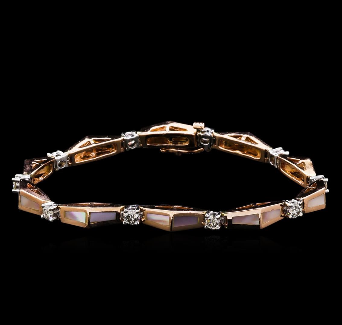 One electronically tested 14KT two-toned white and gold ladies cast and assembled diamond bracelet with a bright polish finish. Condition is good. Seven and one quarter inch length bracelet features a ribbon of chevron shaped rose gold links accented with mother or pearl inlay work, alternated by individually set diamonds, terminating in a concealed clasp with safety. Containing: Ten prong set round brilliant cut diamonds, measuring 3.50 - 3.50 x 2.10mm (depth est) approximate total weight of 10 stones = 0.67ct. Faint brown secondary color throughout. The clarity grade reflects the overall average for the group. Graded in the setting. Clarity I-1 Color I-K. Total weight of diamonds 0.67ct. Total weight of bracelet 19.50 grams. AIG Appraised.