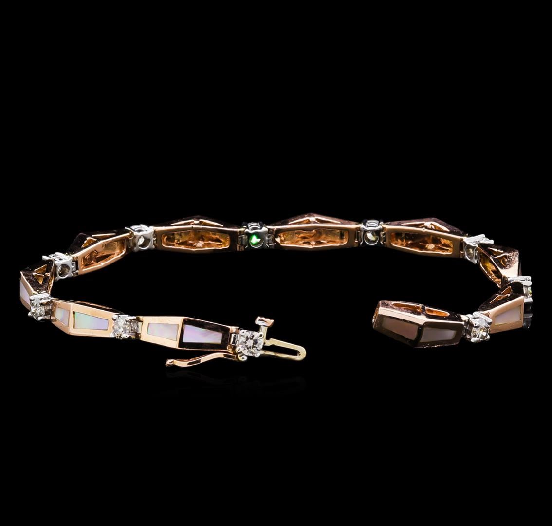 One electronically tested 14KT two-toned white and gold ladies cast and assembled diamond bracelet with a bright polish finish. Condition is good. Seven and one quarter inch length bracelet features a ribbon of chevron shaped rose gold links accented with mother or pearl inlay work, alternated by individually set diamonds, terminating in a concealed clasp with safety. Containing: Ten prong set round brilliant cut diamonds, measuring 3.50 - 3.50 x 2.10mm (depth est) approximate total weight of 10 stones = 0.67ct. Faint brown secondary color throughout. The clarity grade reflects the overall average for the group. Graded in the setting. Clarity I-1 Color I-K. Total weight of diamonds 0.67ct. Total weight of bracelet 19.50 grams. AIG Appraised.