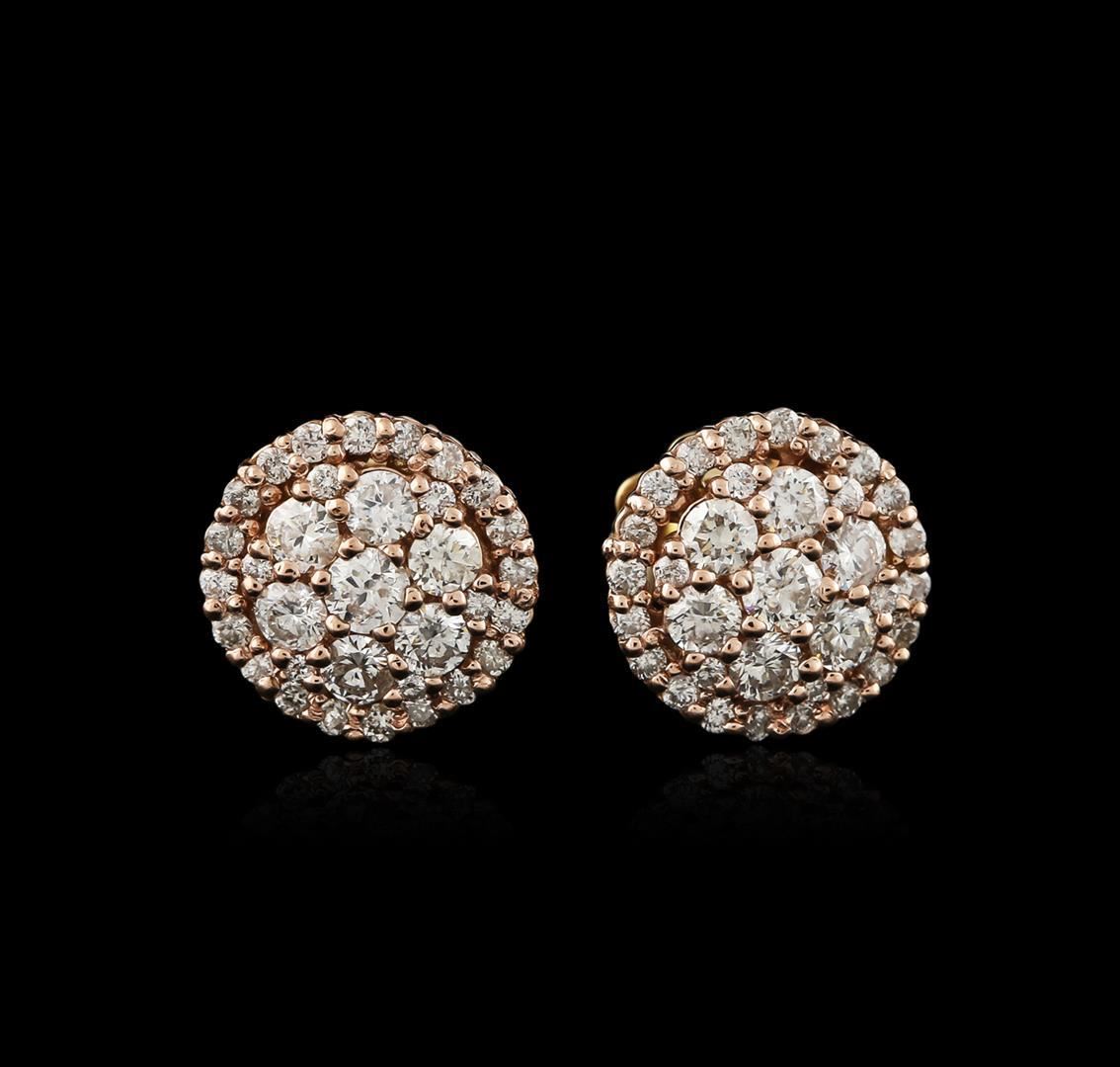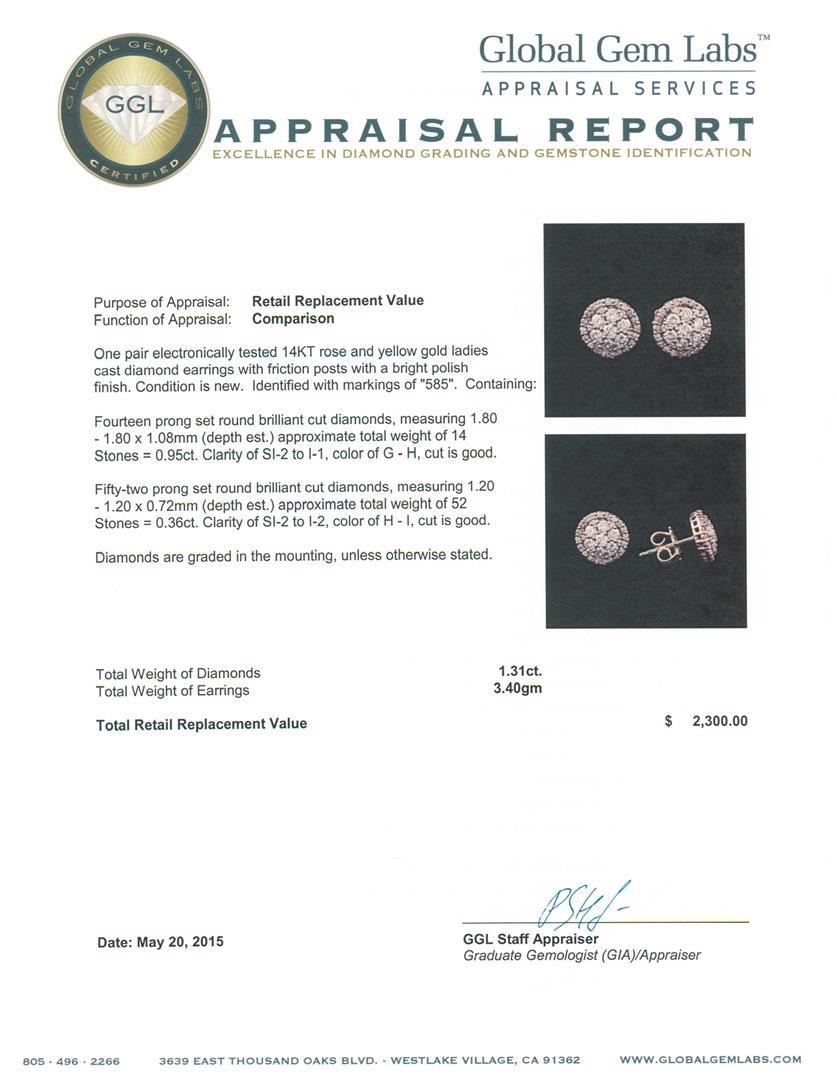 One pair electronically tested 14KT rose and yellow gold ladies cast diamond earrings with friction posts with a bright polish finish. Identified with markings of "585". Condition is new. Containing: Fourteen prong set round brilliant cut diamonds, measuring 1.80 - 1.80 x 1.08mm (depth est.) approximate total weight of 14 Stones = 0.95ct. Clarity: SI-2 to I-1. Color: G - H, Cut is Good. Fifty-Two prong set round brilliant cut diamonds, measuring 1.20 - 1.20 x 0.72mm (depth est.) approximate total weight of 52 Stones = 0.36ct. Clarity: SI-2 to I-2. Color: H - I, Cut is Good. Diamonds are graded in the mounting, unless otherwise stated. Total Weight of Diamonds 1.31ct. Total Weight of Earrings 3.40 grams. GGL Appraised.