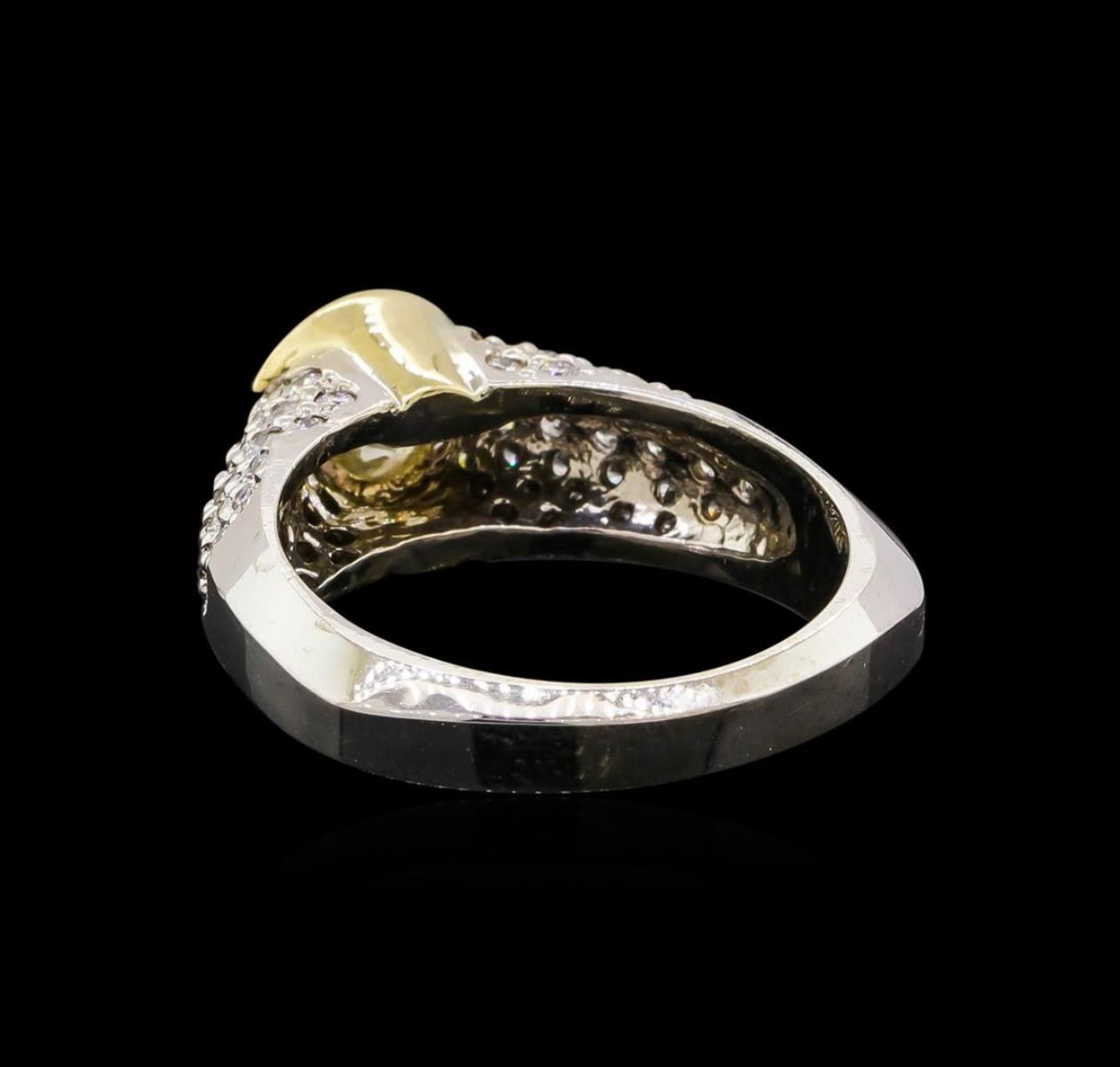 One electronically tested 14KT white and yellow gold ladies cast diamond engagement ring with a bright polish finish. Identified with markings of "14K". Condition is new. Containing: One bezel set round brilliant cut diamond, measuring 6.00 - 6.00 x 3.60mm (depth est.) approximate weight of 0.79ct. Clarity: I-2, Cut is Good. Forty-Four prong set round brilliant cut diamonds, measuring 1.70 - 1.70 x 1.02mm (depth est.) approximate total weight of 44 Stones = 0.79ct. Clarity: SI-1. Color: I - J, Cut is Good. All diamonds are graded in the mounting, unless otherwise stated. Total Weight of Diamonds 1.58ct. Total Weight of Engagement Ring 6.80 grams. GGL Appraised.