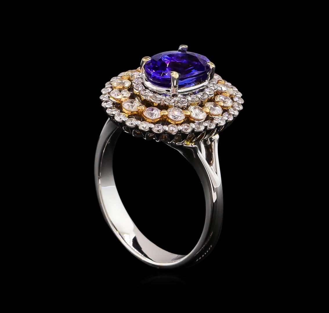 One electronically tested 14KT white and yellow gold Ladies combination cast & assembled ring with a bright polish finish. Condition is new. Identified with markings of "14K". Containing: One prong set oval modified brilliant cut natural tanzanite, measuring 8.60 x 6.40 x 4.60mm, approximate weight of 1.73ct., clarity is eye clean, type I, medium light, very slightly grayish, bluish violet color, (GIA bV 4/3), cut is good. Colored gemstones are presumed to have been subjected to commonly used color/clarity enhancement processes. Fourteen prong set round brilliant cut diamonds, measuring 2.20 - 2.20 x 1.32mm (depth est.) approximate. Total Weight of 14 Stones = 0.55ct. . Clarity: I-1. Color: I - J, Cut is Good. Forty-Eight prong set round brilliant cut diamonds, measuring 1.30 - 1.30 x 0.78mm (depth est.) approximate. Total Weight of 48 Stones = 0.38ct. . Clarity: I-1 to I-2. Color: I - J, Cut is Good. . Total Weight of Colored Stones 1.73ct. Total Weight of Diamonds 0.93ct. Total Weight of Ring 7.70 grams. GGL Appraised.