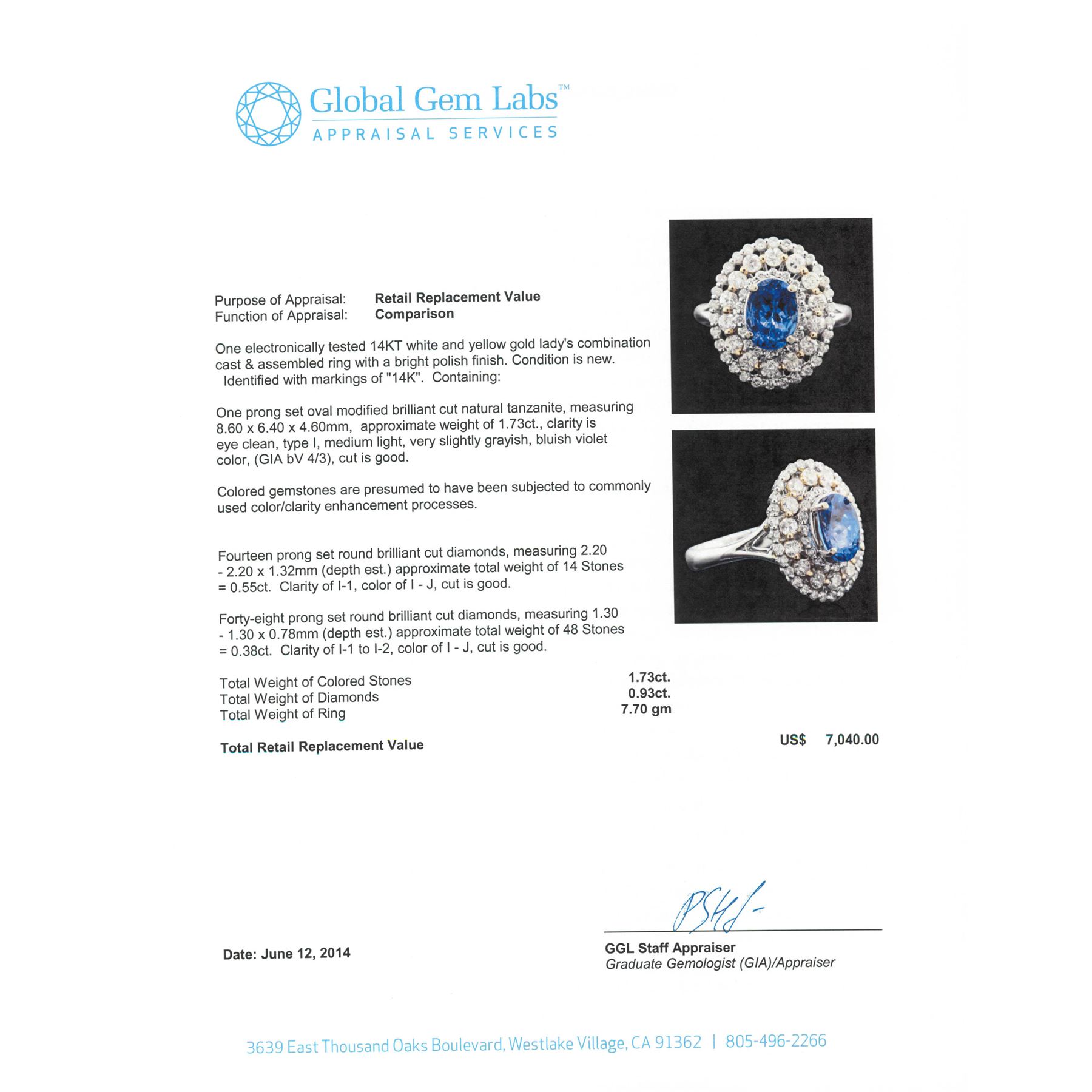 One electronically tested 14KT white and yellow gold Ladies combination cast & assembled ring with a bright polish finish. Condition is new. Identified with markings of "14K". Containing: One prong set oval modified brilliant cut natural tanzanite, measuring 8.60 x 6.40 x 4.60mm, approximate weight of 1.73ct., clarity is eye clean, type I, medium light, very slightly grayish, bluish violet color, (GIA bV 4/3), cut is good. Colored gemstones are presumed to have been subjected to commonly used color/clarity enhancement processes. Fourteen prong set round brilliant cut diamonds, measuring 2.20 - 2.20 x 1.32mm (depth est.) approximate. Total Weight of 14 Stones = 0.55ct. . Clarity: I-1. Color: I - J, Cut is Good. Forty-Eight prong set round brilliant cut diamonds, measuring 1.30 - 1.30 x 0.78mm (depth est.) approximate. Total Weight of 48 Stones = 0.38ct. . Clarity: I-1 to I-2. Color: I - J, Cut is Good. . Total Weight of Colored Stones 1.73ct. Total Weight of Diamonds 0.93ct. Total Weight of Ring 7.70 grams. GGL Appraised.