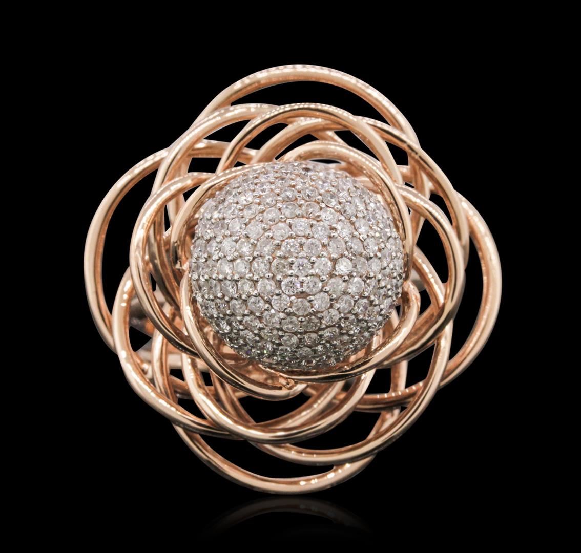 One electronically tested 14KT rose and white gold ladies cast & assembled diamond ring with a bright polish finish. Condition is new, good workmanship. The ring features a white gold diamond encrusted sphere set within intertwining rose gold ribbons, completed by a five millimeter wide band. Identified with markings of "14K". Containing: Two Hundred Eighty pav, set round brilliant cut diamonds, measuring 1.30 - 1.20 x 0.75mm (depth est.) approximate. Total Weight of 280 Stones = 2.10 ct. Graded in the setting. Clarity: I-1 to I-2. Color: G - I. Total Weight of Diamonds 2.10 ct. Total Weight of Ring 17.96gm. AIG Appraised.