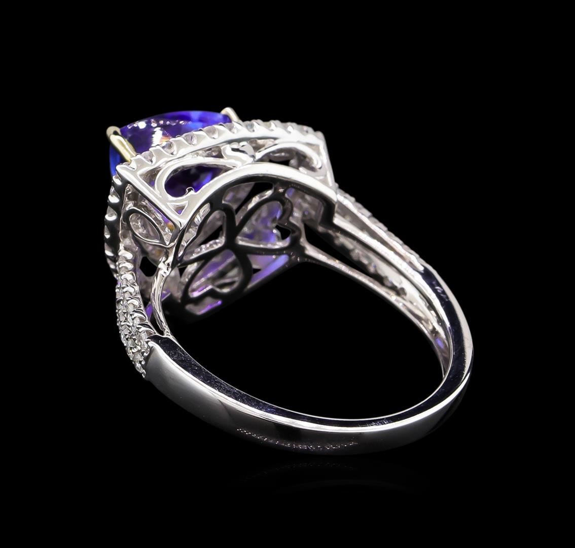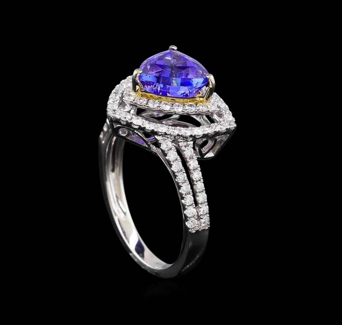 One electronically tested 14KT white and yellow gold Ladies combination cast & assembled ring with a bright polish finish. Condition is new. Identified with markings of "14K". Containing: Eighty-One bead set round brilliant cut diamonds, measuring 1.30 - 1.30 x 0.78mm (depth est.) approximate. Total Weight of 81 Stones = 0.83ct. Clarity: I-1 to I-2. Color: I - J, Cut is Good. One prong set triangle modified mixed cut natural tanzanite, measuring 8.00 x 8.00 x 5.20mm, approximate weight of 2.25ct., clarity is eye clean, type I, medium, moderately strong, bluish violet color, (GIA bV 5/4), cut is very good. Colored gemstones are presumed to have been subjected to commonly used color/clarity enhancement processes. Total Weight of Colored Stones 2.25ct. Total Weight of Diamonds 0.83ct. Total Weight of Ring 4.40 grams. GGL Appraised at $5,365.00.