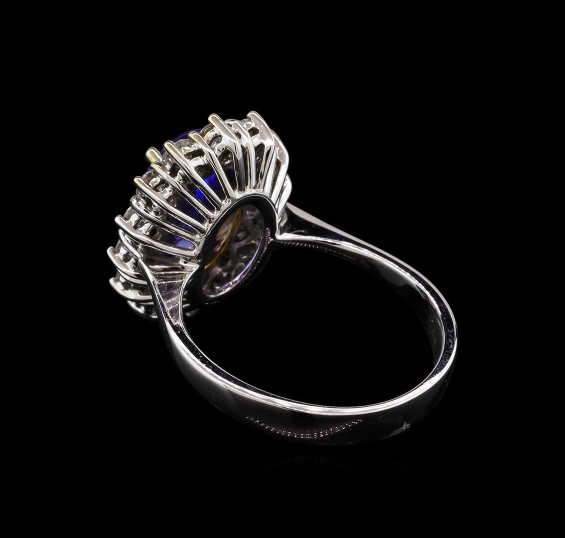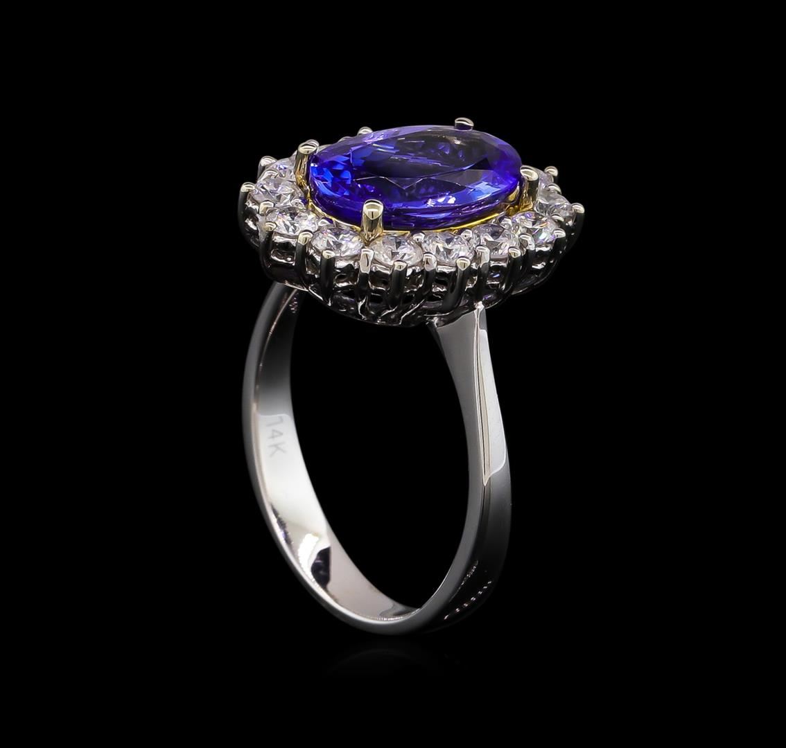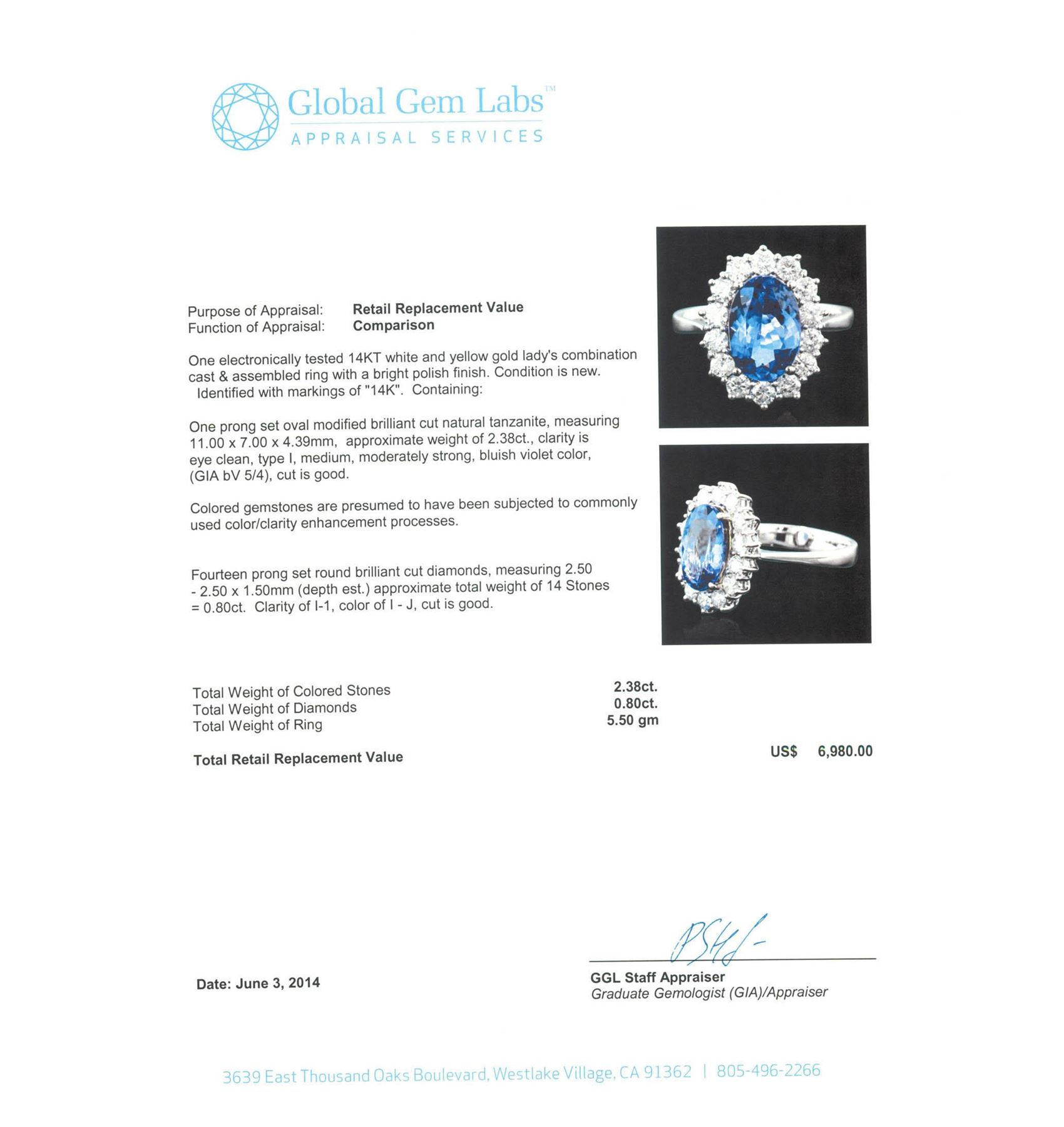 One electronically tested 14KT white and yellow gold Ladies combination cast & assembled ring with a bright polish finish. Condition is new. Identified with markings of "14K". Containing: One prong set oval modified brilliant cut natural tanzanite, measuring 11.00 x 7.00 x 4.39mm, approximate weight of 2.38ct., clarity is eye clean, type I, medium, moderately strong, bluish violet color, (GIA bV 5/4), cut is good. Colored gemstones are presumed to have been subjected to commonly used color/clarity enhancement processes. Fourteen prong set round brilliant cut diamonds, measuring 2.50 - 2.50 x 1.50mm (depth est.) approximate. Total Weight of 14 Stones = 0.80 ct. Clarity: I-1. Color: I - J, Cut is Good. Total Weight of Colored Stones 2.38ct. Total Weight of Diamonds 0.80 ct. Total Weight of Ring 5.50 grams. GGL Appraised.