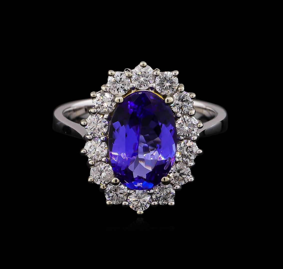 One electronically tested 14KT white and yellow gold Ladies combination cast & assembled ring with a bright polish finish. Condition is new. Identified with markings of "14K". Containing: One prong set oval modified brilliant cut natural tanzanite, measuring 11.00 x 7.00 x 4.39mm, approximate weight of 2.38ct., clarity is eye clean, type I, medium, moderately strong, bluish violet color, (GIA bV 5/4), cut is good. Colored gemstones are presumed to have been subjected to commonly used color/clarity enhancement processes. Fourteen prong set round brilliant cut diamonds, measuring 2.50 - 2.50 x 1.50mm (depth est.) approximate. Total Weight of 14 Stones = 0.80 ct. Clarity: I-1. Color: I - J, Cut is Good. Total Weight of Colored Stones 2.38ct. Total Weight of Diamonds 0.80 ct. Total Weight of Ring 5.50 grams. GGL Appraised.