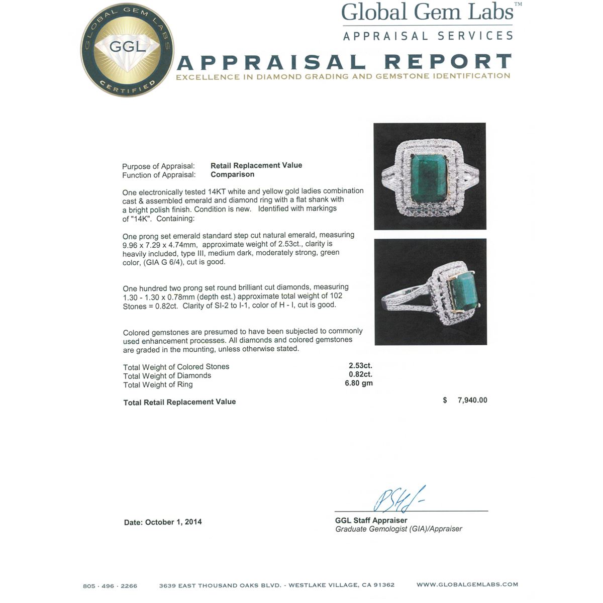 One electronically tested 14KT white and yellow gold ladies combination cast & assembled emerald and diamond ring with a flat shank with a bright polish finish. Identified with markings of "14K". Condition is new. Containing: One prong set emerald standard step cut natural emerald, measuring 9.96 x 7.29 x 4.74mm, approximate weight of 2.53ct., clarity is heavily included, type III, medium dark, moderately strong, green color, (GIA G 6/4), cut is good. One Hundred Two prong set round brilliant cut diamonds, measuring 1.30 - 1.30 x 0.78mm (depth est.) approximate total weight of 102 Stones = 0.82ct. Clarity: SI-2 to I-1. Color: H - I, Cut is Good. Colored gemstones are presumed to have been subjected to commonly used enhancement processes. All diamonds and colored gemstones are graded in the mounting, unless otherwise stated. Total Weight of Colored Stones 2.53ct. Total Weight of Diamonds 0.82ct. Total Weight of Ring 6.80 grams. GGL Appraised at $7,940.00.