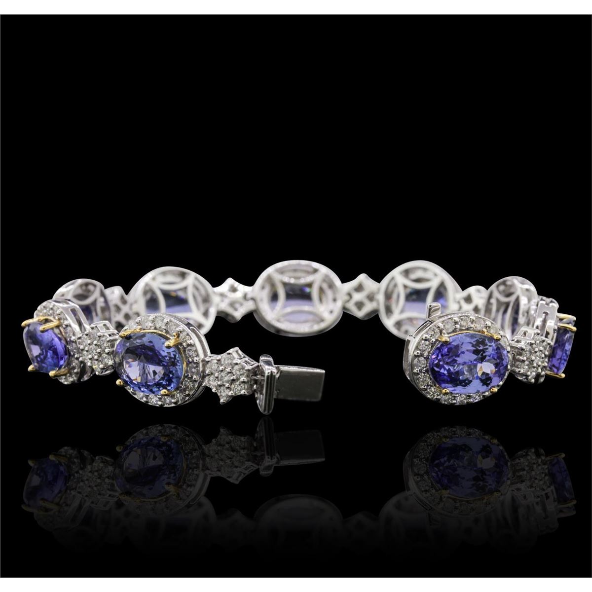 One electronically tested 14KT white and yellow gold ladies combination cast & assembled tanzanite and diamond bracelet with a hidden box clasp with safety closer with a bright polish finish. Measurements: 7.25" in length. Identified with markings of "14K". Condition is new. Containing: Nine prong set oval modified brilliant cut natural tanzanites, measuring 10.93 x 8.27 x 4.63mm, approximate total weight of 25.74ct., clarity is eye clean, type I, medium, moderately strong, bluish violet color, (GIA bV 5/4), cut is very good. Two Hundred Seven prong set round brilliant cut diamonds, measuring 1.60 - 1.30 x 0.87mm (depth est.) approximate total weight of 207 Stones = 2.30ct. Clarity: SI-2 to I-2. Color: H - I, Cut is Good. Colored gemstones are presumed to have been subjected to commonly used enhancement processes. All diamonds and colored gemstones are graded in the mounting, unless otherwise stated. Total Weight of Colored Stones 25.74ct. Total Weight of Diamonds 2.30ct. Total Weight of Bracelet 28.10 grams. GGL Appraised at $38,575.00.