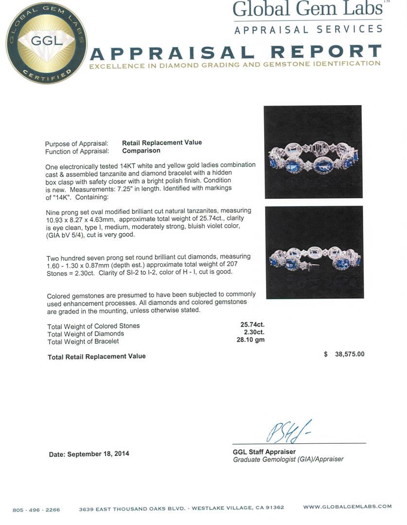 One electronically tested 14KT white and yellow gold ladies combination cast & assembled tanzanite and diamond bracelet with a hidden box clasp with safety closer with a bright polish finish. Measurements: 7.25" in length. Identified with markings of "14K". Condition is new. Containing: Nine prong set oval modified brilliant cut natural tanzanites, measuring 10.93 x 8.27 x 4.63mm, approximate total weight of 25.74ct., clarity is eye clean, type I, medium, moderately strong, bluish violet color, (GIA bV 5/4), cut is very good. Two Hundred Seven prong set round brilliant cut diamonds, measuring 1.60 - 1.30 x 0.87mm (depth est.) approximate total weight of 207 Stones = 2.30ct. Clarity: SI-2 to I-2. Color: H - I, Cut is Good. Colored gemstones are presumed to have been subjected to commonly used enhancement processes. All diamonds and colored gemstones are graded in the mounting, unless otherwise stated. Total Weight of Colored Stones 25.74ct. Total Weight of Diamonds 2.30ct. Total Weight of Bracelet 28.10 grams. GGL Appraised.