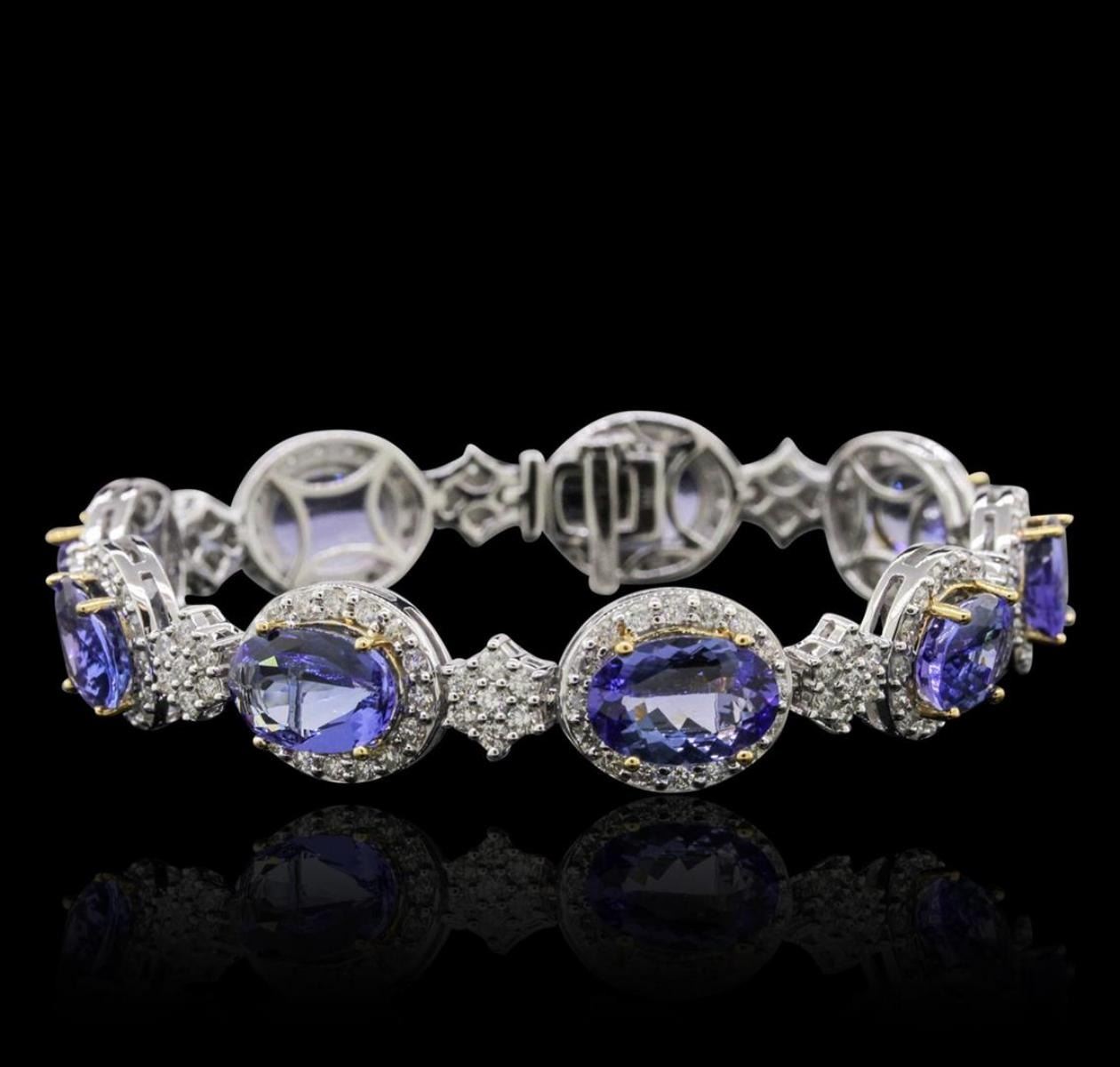 One electronically tested 14KT white and yellow gold ladies combination cast & assembled tanzanite and diamond bracelet with a hidden box clasp with safety closer with a bright polish finish. Measurements: 7.25" in length. Identified with markings of "14K". Condition is new. Containing: Nine prong set oval modified brilliant cut natural tanzanites, measuring 10.93 x 8.27 x 4.63mm, approximate total weight of 25.74ct., clarity is eye clean, type I, medium, moderately strong, bluish violet color, (GIA bV 5/4), cut is very good. Two Hundred Seven prong set round brilliant cut diamonds, measuring 1.60 - 1.30 x 0.87mm (depth est.) approximate total weight of 207 Stones = 2.30ct. Clarity: SI-2 to I-2. Color: H - I, Cut is Good. Colored gemstones are presumed to have been subjected to commonly used enhancement processes. All diamonds and colored gemstones are graded in the mounting, unless otherwise stated. Total Weight of Colored Stones 25.74ct. Total Weight of Diamonds 2.30ct. Total Weight of Bracelet 28.10 grams. GGL Appraised.