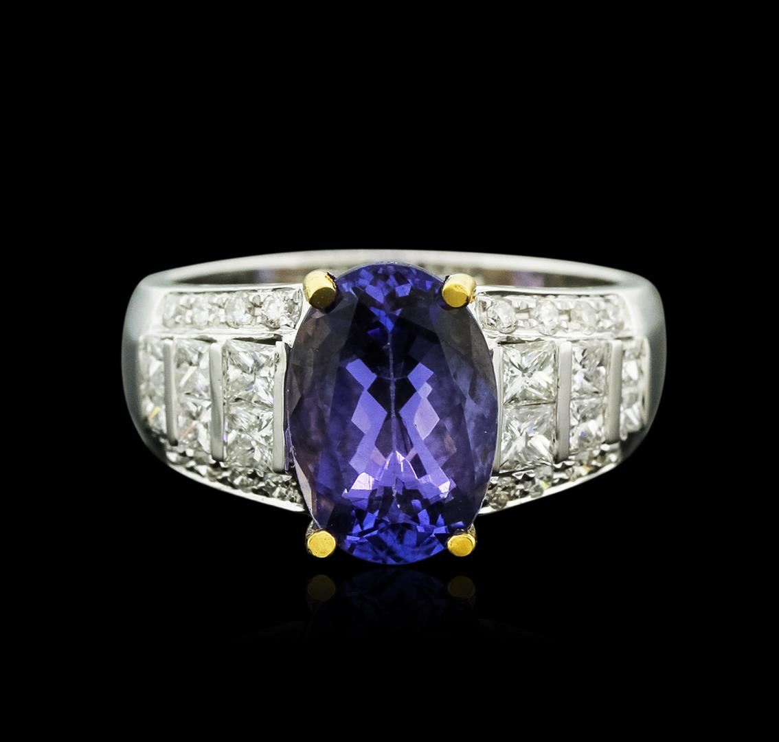 One electronically tested 14KT white and yellow gold ladies cast tanzanite and diamond ring with a bright polish finish. Identified with markings of "14K". Condition is new. Containing: One prong set oval modified brilliant cut natural tanzanite, measuring 11.50 x 7.80 x 6.20mm, approximate weight of 3.91ct., clarity is eye clean, type I, medium, moderately strong, violet color, (GIA V 5/4), cut is good. Sixteen prong set round brilliant cut diamonds, measuring 1.20 - 1.20 x 0.72mm (depth est.) approximate total weight of 16 Stones = 0.10ct. Clarity: SI-2 to I-1. Color: I - J, Cut is Good. Twelve channel set princess cut diamonds, measuring 2.50 x 2.50 x 1.88mm (depth est.) approximate total weight of 12 Stones = 1.16ct. Clarity: SI-1 to SI-2. Color: I - J, Cut is Good. Colored gemstones are presumed to have been subjected to commonly used enhancement processes. All diamonds and colored gemstones are graded in the mounting, unless otherwise stated. Total Weight of Colored Stones 3.91ct. Total Weight of Diamonds 1.26ct. Total Weight of Ring 5.80 grams. GGL Appraised at $5,325.00.